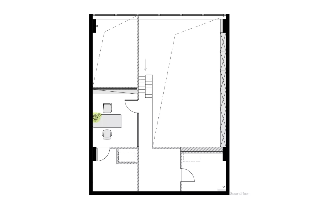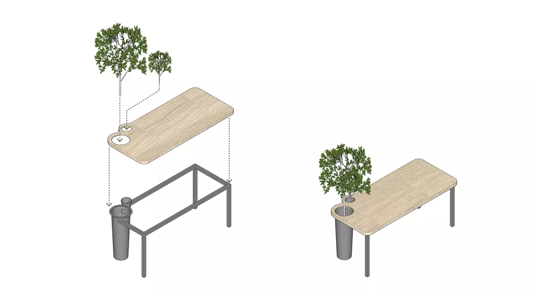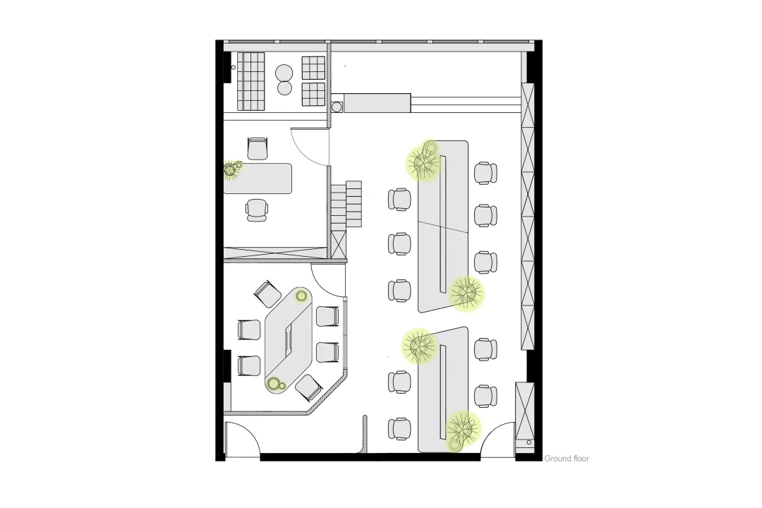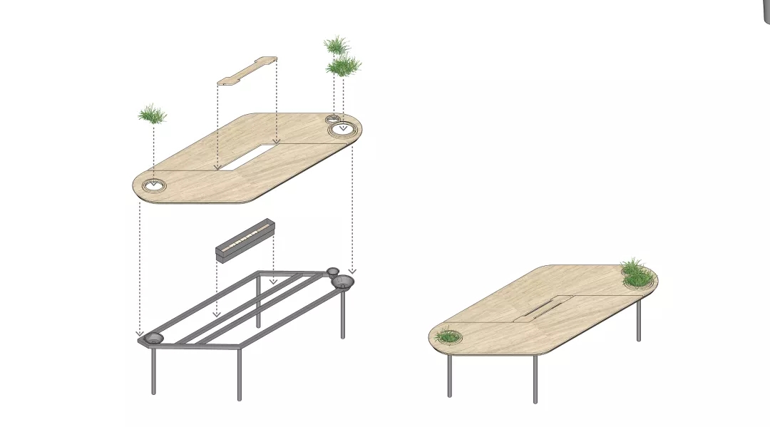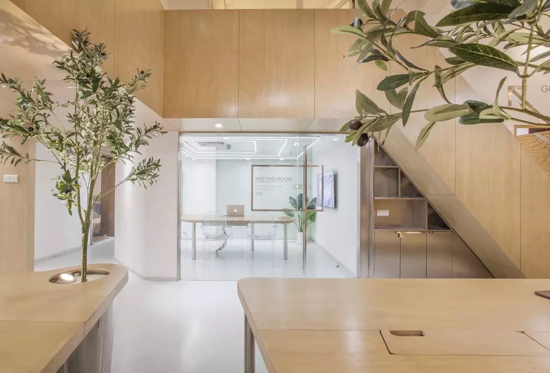 同時(shí)我們希望有一個(gè)張別具一格的會(huì)議桌,但是會(huì)議桌極強(qiáng)的功能性使得難以去進(jìn)行改變。于是,會(huì)議室空間本身的形狀缺陷成了這張桌子想法的起點(diǎn)。由于避讓入口玄關(guān),會(huì)議室空間有一個(gè)角是切掉的,墻壁是斜著放置,如果是長方形的會(huì)議桌,就必然在這個(gè)斜墻前造成使用空間不夠缺陷,無法坐人.所以就產(chǎn)生了一個(gè)平行四邊形的會(huì)議桌,斜邊與空間的斜墻平行,也讓整個(gè)斜墻前的空間可以坐下一個(gè)參會(huì)者,再嵌入一些小草,一張獨(dú)特又實(shí)用的會(huì)議桌就出來了。
