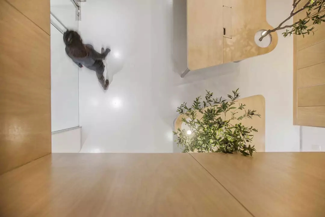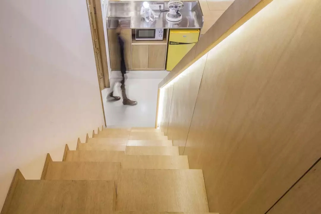 ▲交錯(cuò)的樓梯節(jié)省了樓梯的長度,避開了頭頂?shù)臋M梁,順帶凹個(gè)造型
