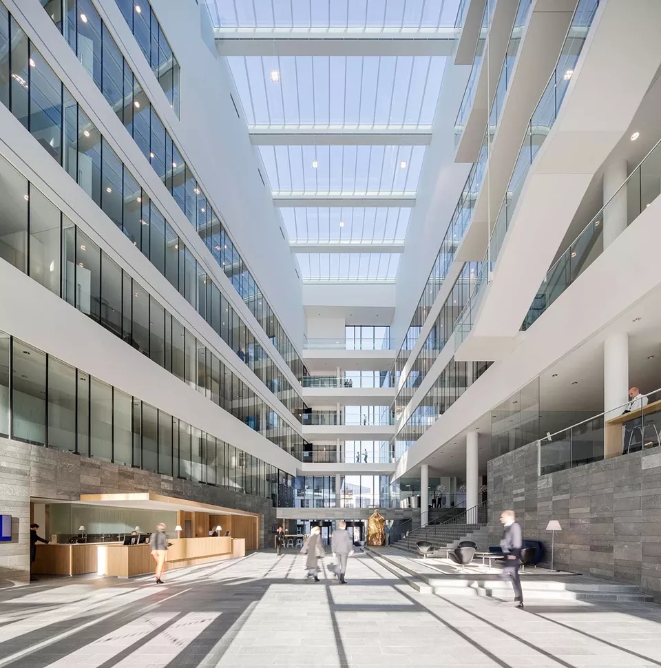 Nordea新總部擁有兩個(gè)令人難忘的中庭空間。其中一間為斯堪的納維亞半島最大的交易大廳,可容納 600名交易員,并可以觀賞到AmagerFælled的自然風(fēng)光。而另一間中庭則成為了客戶與員工之間的互動(dòng)場(chǎng)所。兩個(gè)中庭的區(qū)域讓建筑變得開放自由,如同城市中的公共空間,人們?cè)谶@里相遇、共進(jìn)午餐以及參加非正式會(huì)議,同時(shí)也是各個(gè)部門開展內(nèi)部活動(dòng)的好地方。