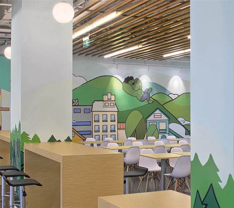 空間氛圍不同,所以圖形裝飾也會(huì)因地制宜的改變,用暖色更動(dòng)態(tài)的感覺。繪制的粉筆畫,可以定期的更換,像黑板報(bào)一樣制定不同的主題,它就是一面活的展示墻。