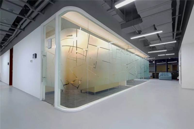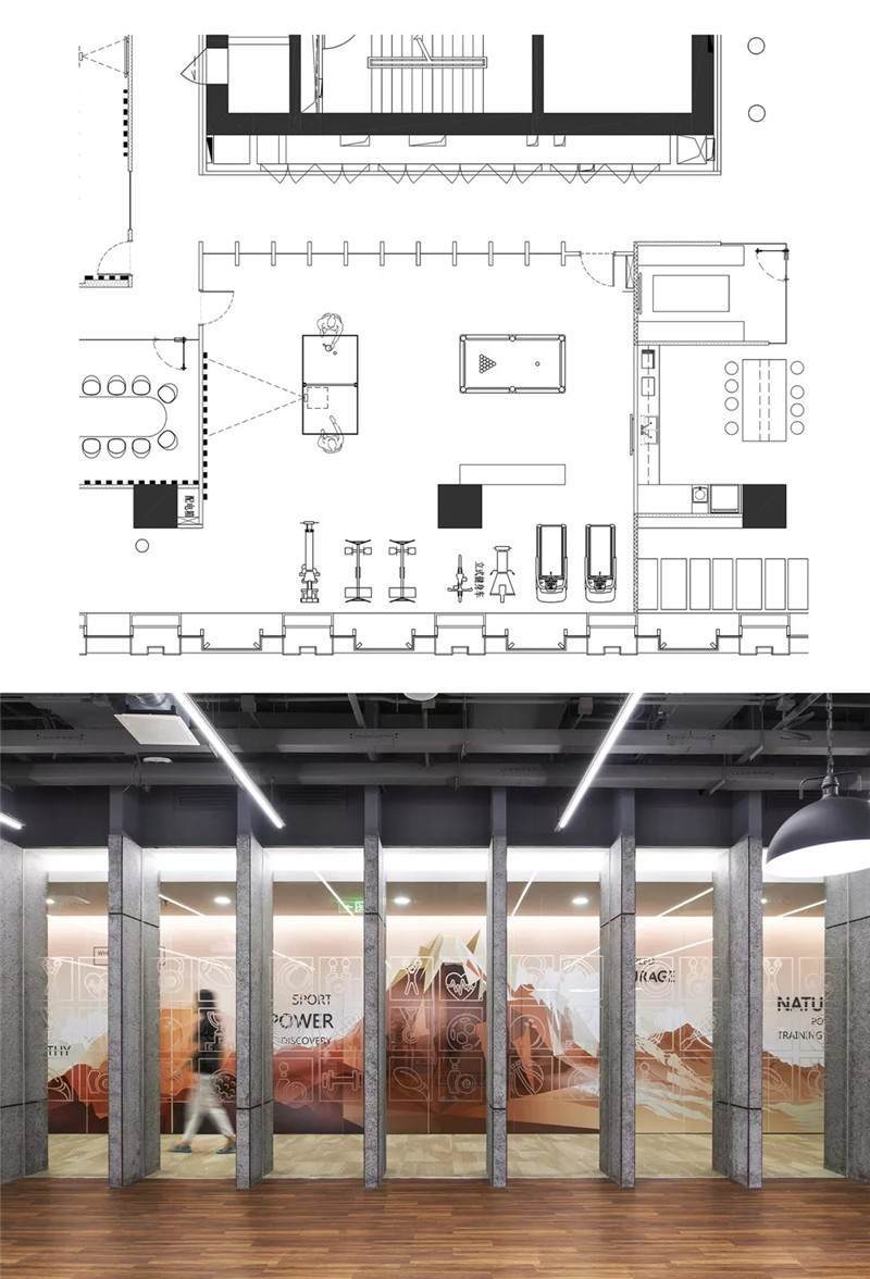 健身房采用的是隔墻類的隔斷,透過隔墻隔斷玻璃能看到核心筒的走道,核心筒的墻面是一幅大型的噴繪畫,結(jié)合立體字,畫面比較震撼,再通過健身房往外看就會(huì)產(chǎn)生非常豐富的層次感。玻璃隔斷上也有小的磨砂圖案,形成了戲劇性的效果,使空間的層次更加突出。