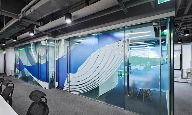 第二張中可以看到,桌上足球,這一張是會(huì)議室的玻璃貼膜,最初設(shè)計(jì)的都是一些彩色的圓點(diǎn),但是做完后太通透,起不到遮擋作用,所以現(xiàn)場(chǎng)臨時(shí)在玻璃的內(nèi)側(cè)又加了大型的磨砂圓,就有兩層疊加到一起的圖形,磨砂與色彩組合在一起,效果豐富有層次。