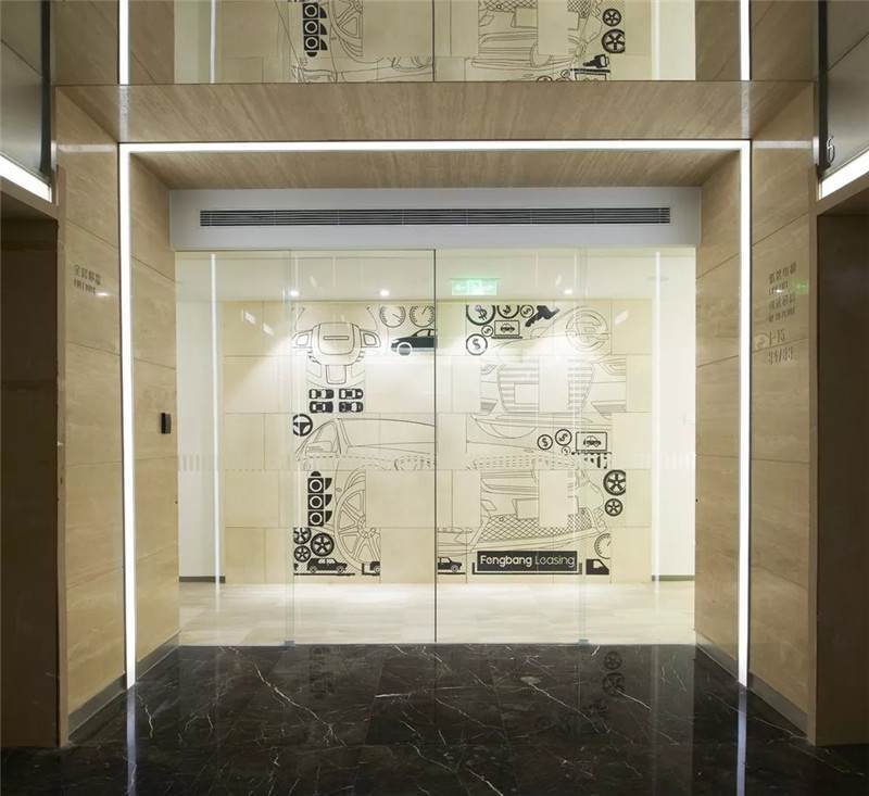 會(huì)議室的玻璃貼膜采用的三種元素組成貼膜設(shè)計(jì),一個(gè)是地圖元素應(yīng)用的APP是相關(guān)的,第二個(gè)元素是定位點(diǎn)穿插在其中。第三個(gè)因素是不同的建筑。