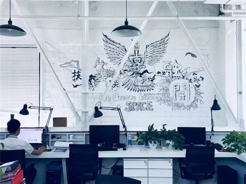 比如這張圖,也是華米科技北京的辦公室,用奧松板開兩個(gè)洞,精巧可愛的睡眠艙趴在墻上,利用兩個(gè)洞把它組成了自行車的輪廓,超萌的壁畫使墻面不再單一,色彩的對(duì)比更加直觀,同時(shí)用太空艙的形式增添趣味點(diǎn),不論是做設(shè)計(jì)師還是做工匠,都要秉持設(shè)計(jì)的理念去進(jìn)行選材和制造工藝,把握好每一個(gè)細(xì)節(jié)。