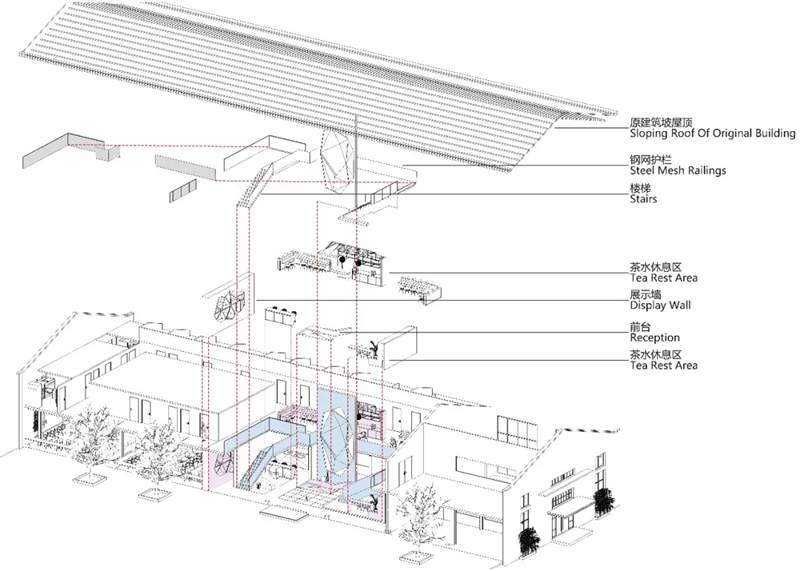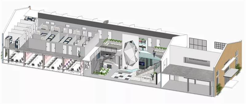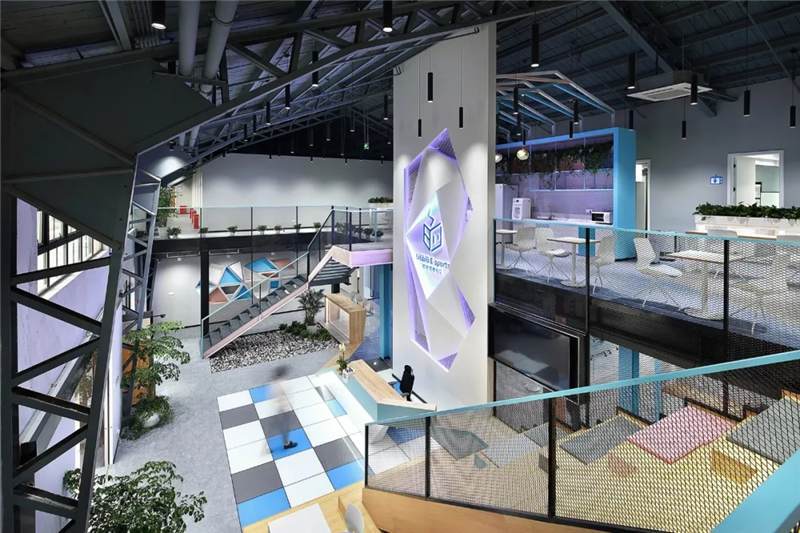 本案位于上海市寶山區(qū)蘊(yùn)川路6號(hào)智慧灣科創(chuàng)園,原建筑為3D打印的廠房裝修,室內(nèi)最高凈高9米,最低6.4米。此空間除原建筑結(jié)構(gòu)墻外,無任何結(jié)構(gòu)柱與墻體,因此為了更充分合理的利用空間,設(shè)計(jì)師構(gòu)筑了二層,根據(jù)嗶哩嗶哩電競(jìng)的辦公功能訴求,布置空間功能區(qū),即1F分布前臺(tái)區(qū)、會(huì)議區(qū)、茶水接待區(qū)、賽訓(xùn)室、開敞辦公區(qū)、導(dǎo)播室。2F分布就餐區(qū)、住宿區(qū)、導(dǎo)播室等空間。