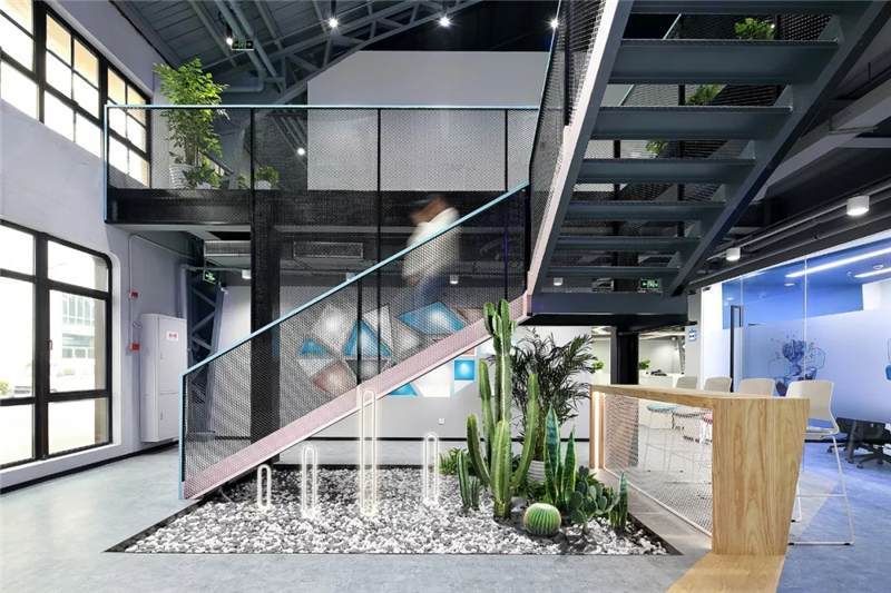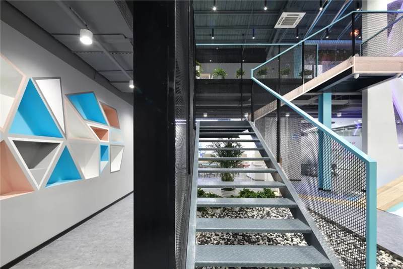 前廳左側(cè),設(shè)計(jì)結(jié)構(gòu)簡單的樓梯,運(yùn)用與二層欄桿材質(zhì)相同的鐵絲網(wǎng)扶手,使得兩層樓形成一個(gè)工業(yè)風(fēng)的整體。側(cè)邊與扶手點(diǎn)綴以藍(lán)色和粉色的噴漆,樓梯下布置用鵝卵石,仙人掌和燈光組成的景觀裝置小品,讓整個(gè)電競(jìng)空間生機(jī)勃勃,平添許多年輕活躍的氛圍。此處木飾面的吧臺(tái)延伸到地面再與前臺(tái)、右側(cè)大臺(tái)階連接形成一個(gè)整體,使整個(gè)空間更加連貫統(tǒng)一。