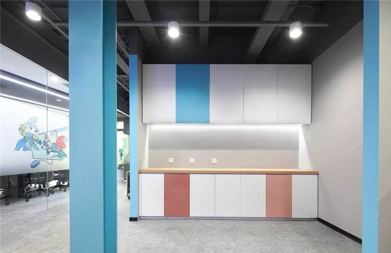吊柜打破了傳統(tǒng)的平開門形式,使用開放的彩色盒子,實(shí)用兼裝飾功能。另外設(shè)計(jì)師還根據(jù)層高差,在茶水區(qū)頂部設(shè)計(jì)三角形格柵,茶水柜上方及背景墻后方,點(diǎn)綴綠植,使整個(gè)空間富有生態(tài)氣息,在光影的效果呈現(xiàn)別樣風(fēng)采。