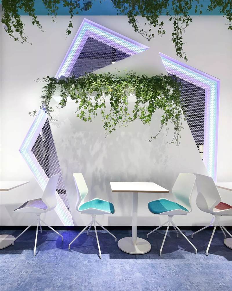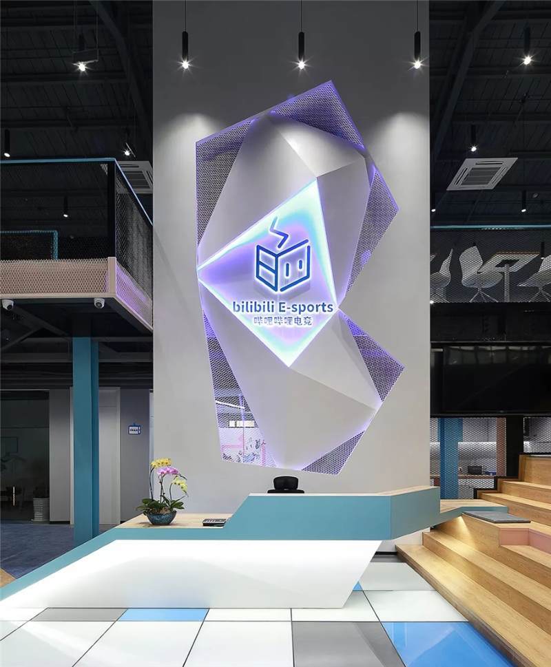前臺(tái)接待區(qū)利用建筑結(jié)構(gòu)挑空空間的優(yōu)勢(shì),塑造9米高的具有未來雕塑造型藝術(shù)感的LOGO背景墻,結(jié)構(gòu)形態(tài)上,設(shè)計(jì)師運(yùn)用B站文化中的創(chuàng)意與元素,中間由三維立體幾何造型與鐵絲網(wǎng)拼接而成,配以藍(lán)色燈光,彰顯公司文化的同時(shí)呈現(xiàn)電競(jìng)的科技感,使得整體背景墻,體量和形態(tài)上給往來訪客和員工強(qiáng)烈的視覺沖擊感。