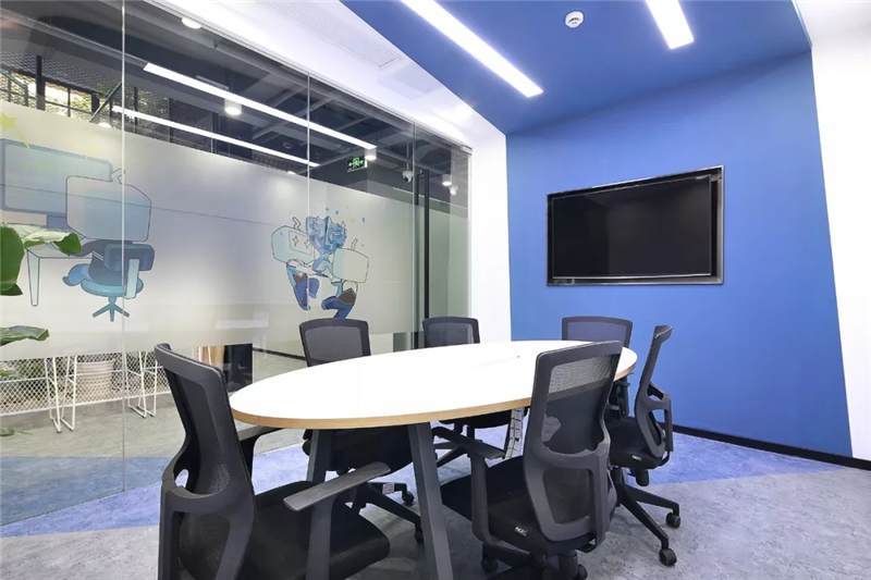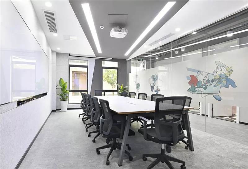 開放辦公區(qū)主體用大量的白色,更加干凈、簡潔;頂面燈具使用粉色,與其他區(qū)域相呼應(yīng);地面采用兩種地膠拼接,也使得空間更加有層次感。大小不同的會(huì)議空間設(shè)計(jì),運(yùn)用了天花到墻面再到地面的連貫造型,增加整個(gè)會(huì)議空間的靈活性。
