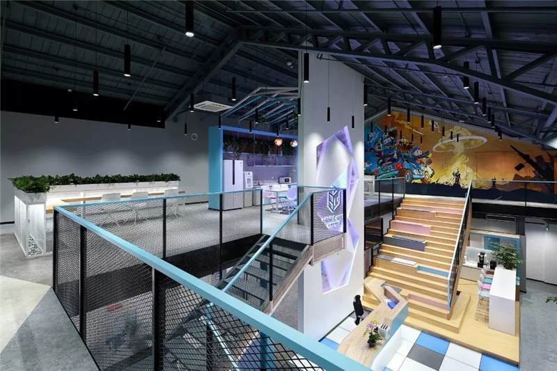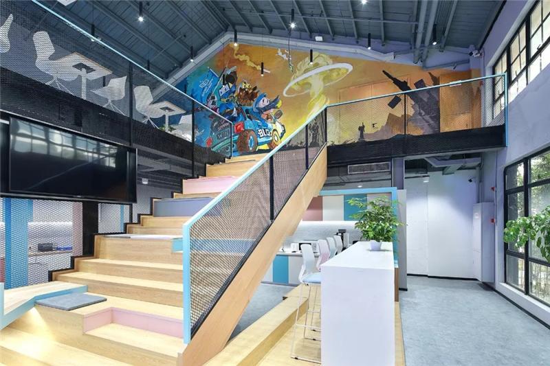 二層大臺(tái)階入口處設(shè)計(jì)師設(shè)置醒目的電競(jìng)主題手繪圖,巧妙的把原本的雙開門變成隱形門,墻內(nèi)部為電競(jìng)導(dǎo)播室。手繪圖豐富的色彩,突出的電競(jìng)主題,卡通的形象,把BILIBILI的風(fēng)格呈現(xiàn)的淋漓盡致。