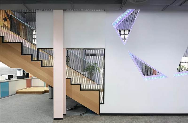 前廳區(qū)右側(cè),是直通二樓的木飾面步梯,臺(tái)階加寬,高度錯(cuò)落有致,LOGO藍(lán),粉,灰與原木色相間,這不僅僅是上下樓梯,更承載著員工的休憩與溝通交流功能,因此增強(qiáng)該區(qū)域的趣味性。步梯后方和右側(cè)吧臺(tái)巧妙的設(shè)計(jì)成一個(gè)連貫性的茶水區(qū),吧臺(tái)錯(cuò)落在茶水柜延伸出的區(qū)域,搭配綠植,增添生機(jī)和活力。
