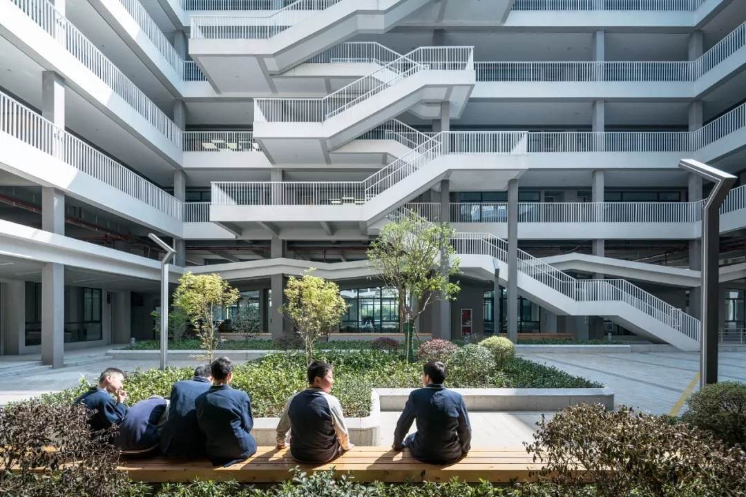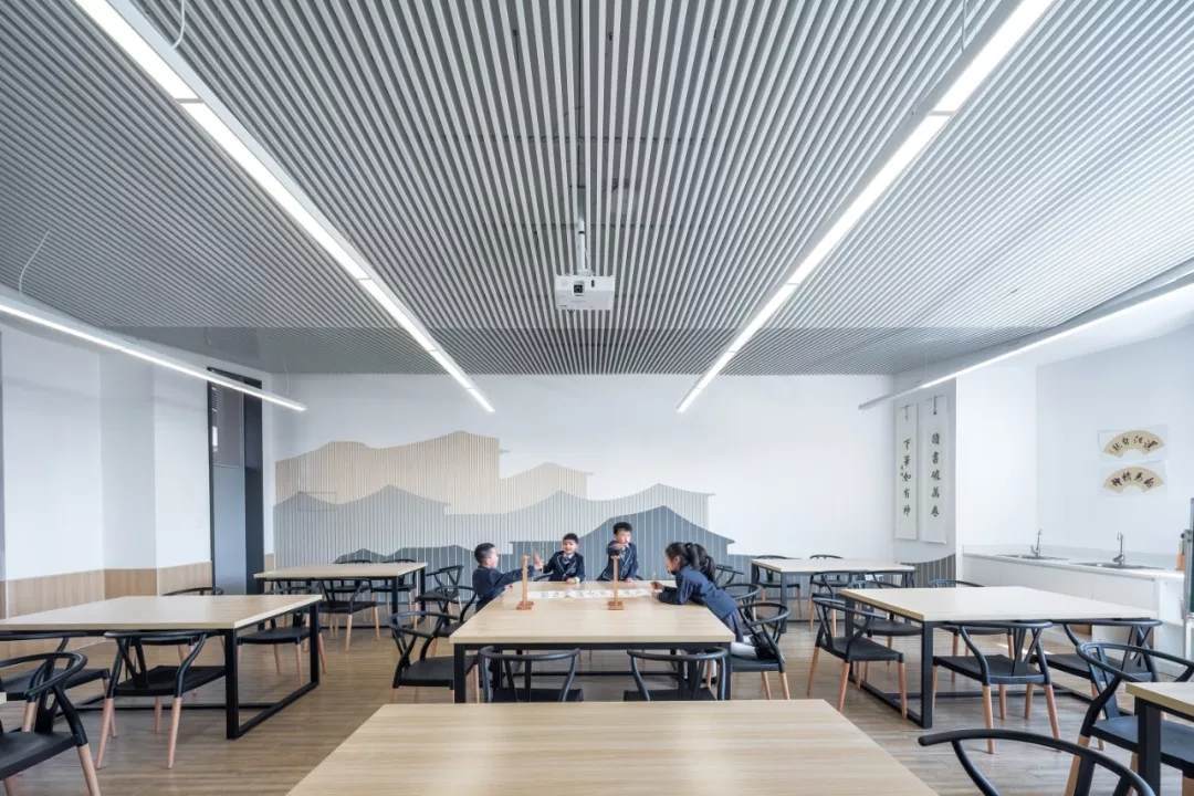校園首層裙房的折面屋頂鋪滿了小青瓦,是中國(guó)傳統(tǒng)建筑中最常見(jiàn)的一種材料之一。從上層建筑向外眺望就可以看到,瓦片不僅起到建筑屋面保溫防水的作用,還為整個(gè)校園帶來(lái)了一份優(yōu)雅和淡然。