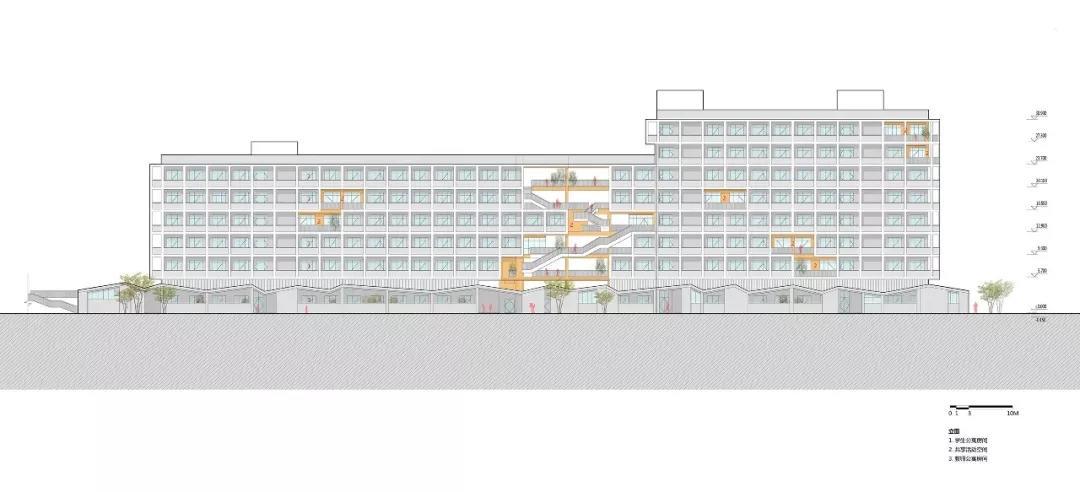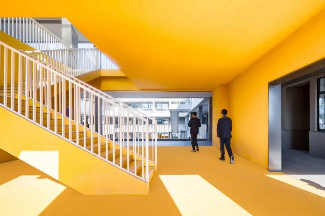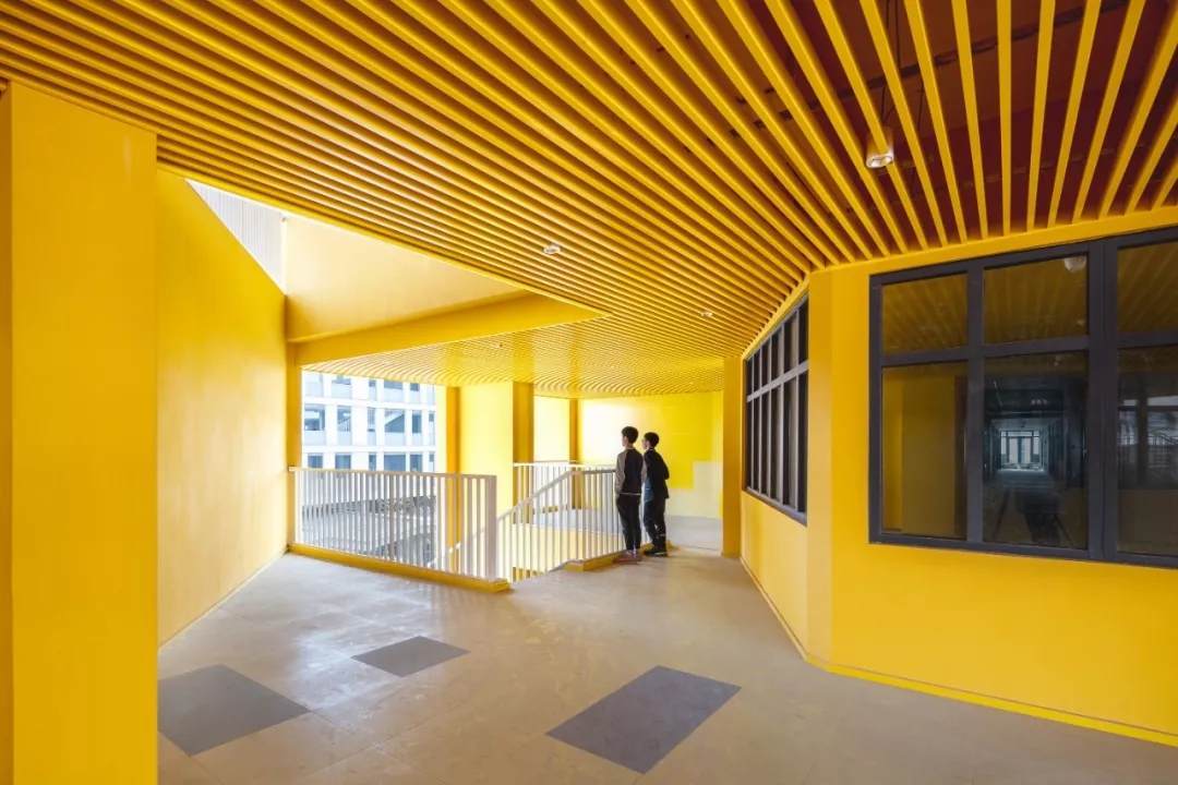 此外,設(shè)計(jì)在教室與地面集中活動(dòng)場(chǎng)地之間創(chuàng)造了中間層級(jí)的活動(dòng)場(chǎng)地,讓課間短暫的時(shí)間也能讓學(xué)生充分玩耍。把教學(xué)樓和宿舍樓局部的體塊掏空形成半開(kāi)放的活動(dòng)空間,將掏空與開(kāi)洞這種二維的建筑元素增加了一維,表面上看是把原有的實(shí)體空間減少了一部分,實(shí)則掏空的部分成為了學(xué)生課外活動(dòng)、接觸自然的場(chǎng)所,增加了整體空間的豐富程度,反而達(dá)到了100-1=101的效果。并且,活動(dòng)空間被設(shè)計(jì)為統(tǒng)一的明黃色,配合午間陽(yáng)光的光影效果,為校園增添活力的同時(shí)增強(qiáng)辨識(shí)度與歸屬感,促進(jìn)學(xué)生們的溝通交流。