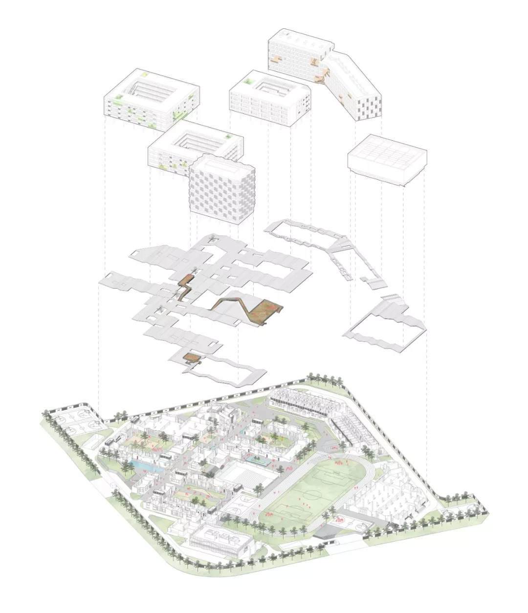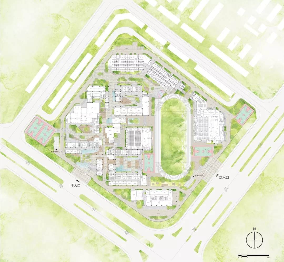 整個(gè)校園場(chǎng)地是一個(gè)呈45度朝向的矩形,建筑密度達(dá)到1.4,遠(yuǎn)超0.8的平均標(biāo)準(zhǔn),場(chǎng)地空間利用非常緊張。如此高密度環(huán)境下的校園建筑規(guī)劃設(shè)計(jì),是一場(chǎng)空間的游戲也是一道數(shù)學(xué)題:通過(guò)規(guī)劃的布局最終滿足一個(gè)容積率的等式。解開(kāi)這道“數(shù)學(xué)題”的同時(shí)又能滿足校園親切舒適的尺度成為了規(guī)劃的核心問(wèn)題。