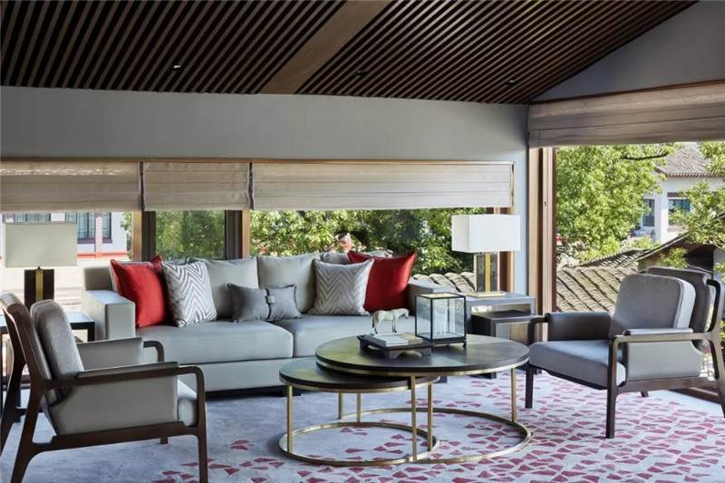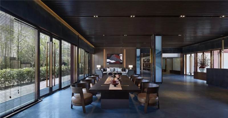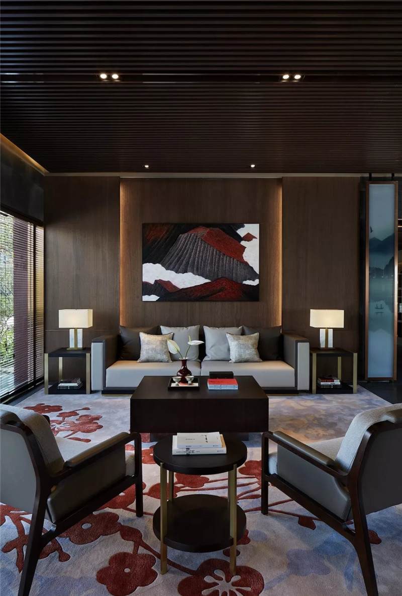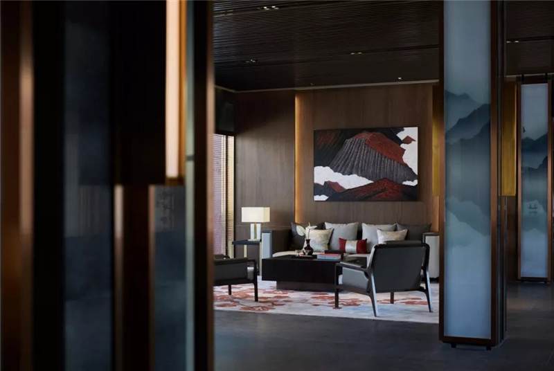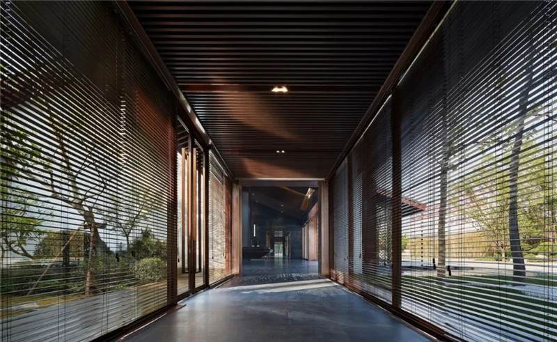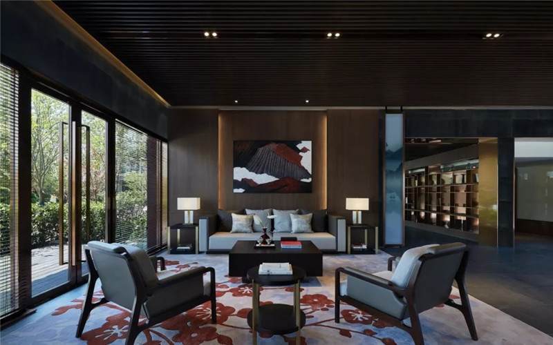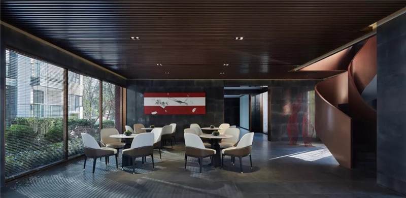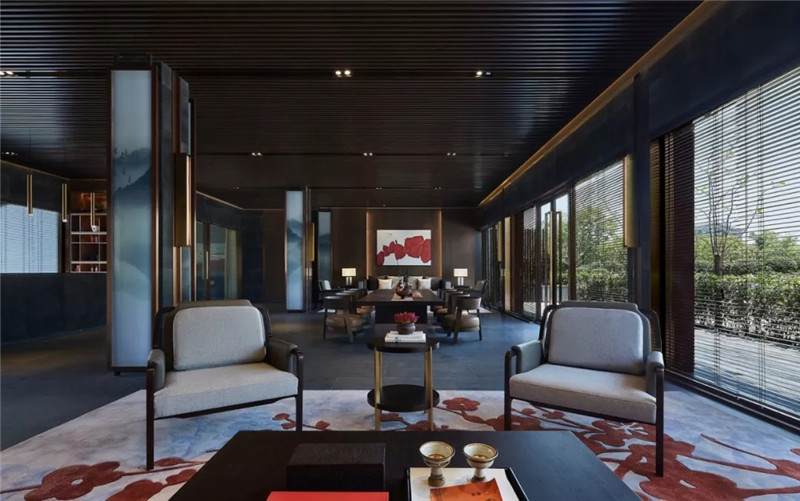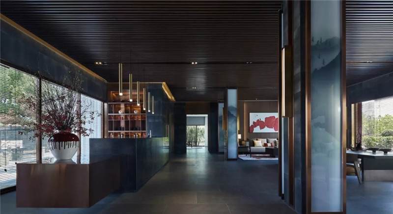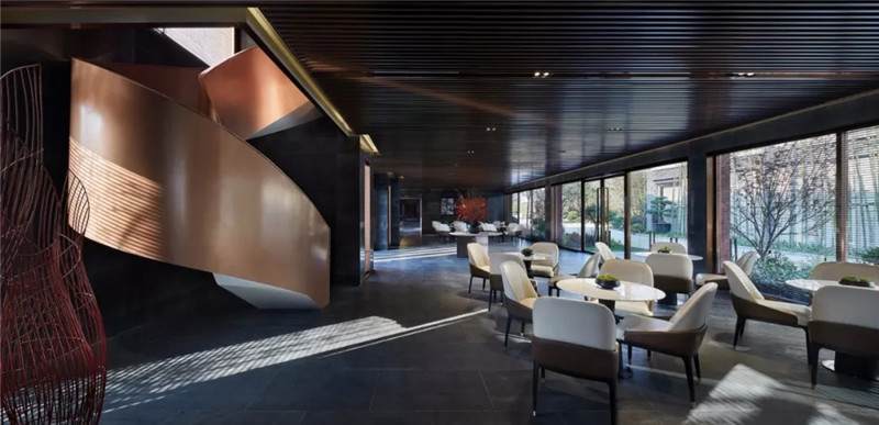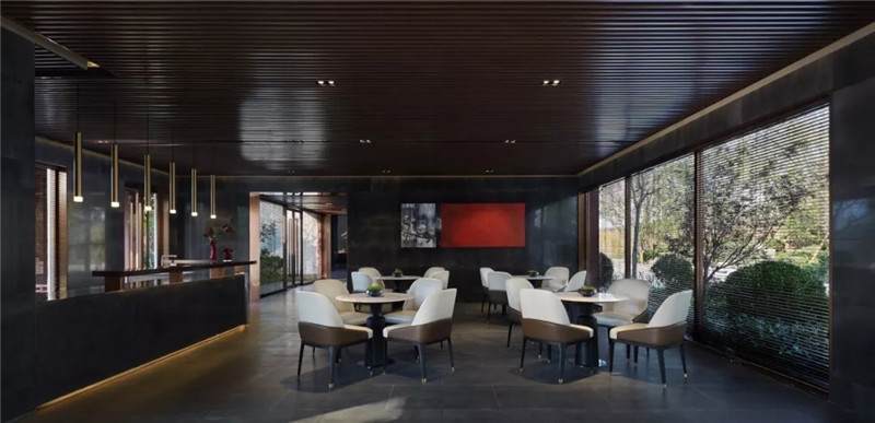 大堂西側(cè),全景落地玻璃及百葉搭配,加以園林框景手法,呈現(xiàn)意境之美、隱隱約約之效。穿回廊而過(guò),便見(jiàn)洽談區(qū),頓時(shí)豁然開(kāi)朗。