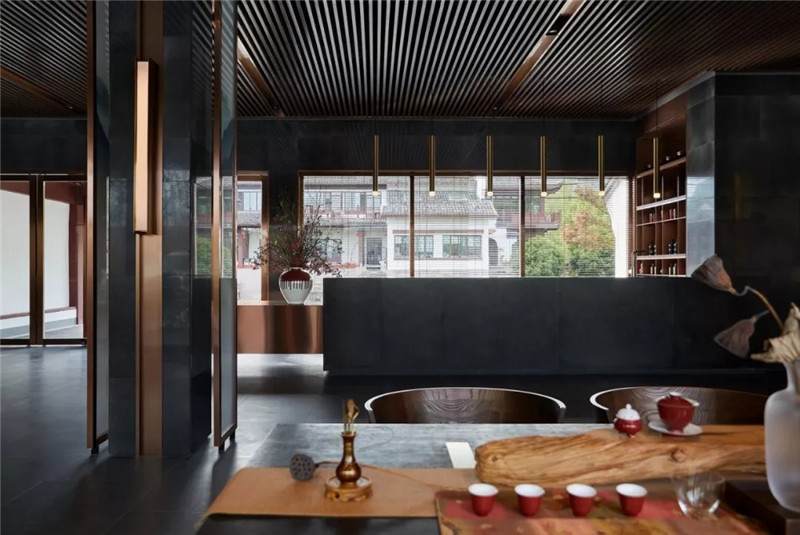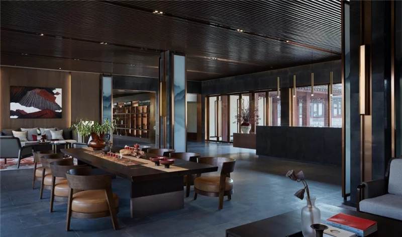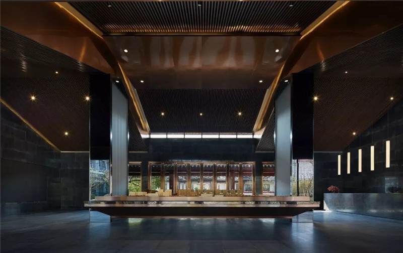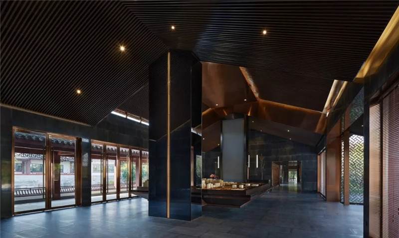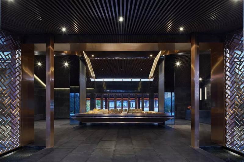 大堂內(nèi)注重材質(zhì)的克制與平衡,大面的黑色基底將儀式感與雄渾氣勢(shì)渲染而出。金屬鏤空格柵顯江南韻律,斜屋頂及頂端挑空區(qū)窗口,則是對(duì)傳統(tǒng)物態(tài)的解構(gòu)與再造。剝開(kāi)視覺(jué)表象,映射出來(lái)的是現(xiàn)代、東方、藝術(shù)、自然等內(nèi)核元素,給賓客無(wú)與倫比的感官體驗(yàn)。
