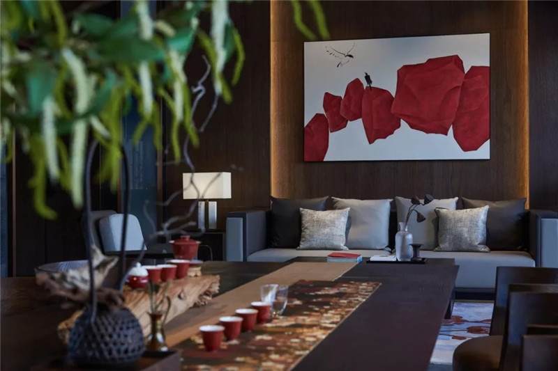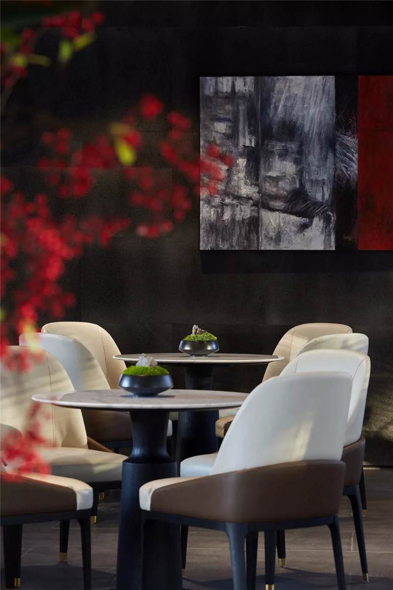 桌面借由點(diǎn)點(diǎn)紅綠添色,打破單調(diào),越發(fā)渲染生機(jī)與活力。兩端放置著極富水墨暈染狀的抽象畫(huà)作,以厚重的文化底蘊(yùn)來(lái)響應(yīng)當(dāng)下的時(shí)空與場(chǎng)域。