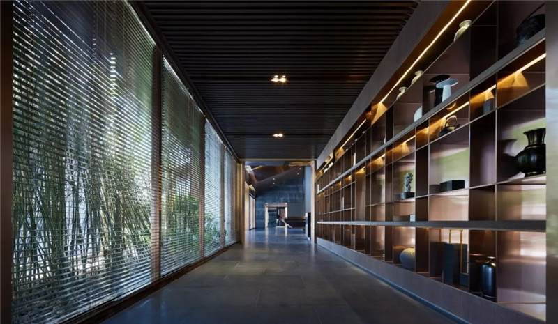 大堂東側(cè),因勢(shì)利用通道設(shè)置藝術(shù)長(zhǎng)廊,充沛的線條韻律,靈動(dòng)的格架鏤空分割,虛實(shí)相生互補(bǔ),氣場(chǎng)也在隨之巧妙切換。