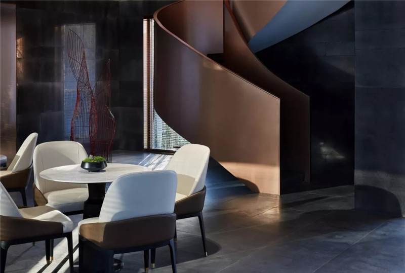 古銅包裹樓梯螺旋而上,功用與審美效果兼具。一隅而立的“蝶影”雕塑以曲線自然伸展,仿若蝶兒展翅欲語(yǔ)芬芳。二者既有體態(tài)上的匹配,又為空間增添了幾絲柔和與輕盈。