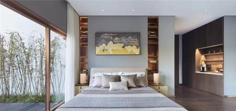 客房套間以現(xiàn)代簡(jiǎn)約風(fēng)范融入自然,呈現(xiàn)安寧愜意之境。設(shè)計(jì)師賦予其三面環(huán)景的奢享體驗(yàn),實(shí)現(xiàn)室內(nèi)與自然的對(duì)話,物器與光影的互動(dòng)。