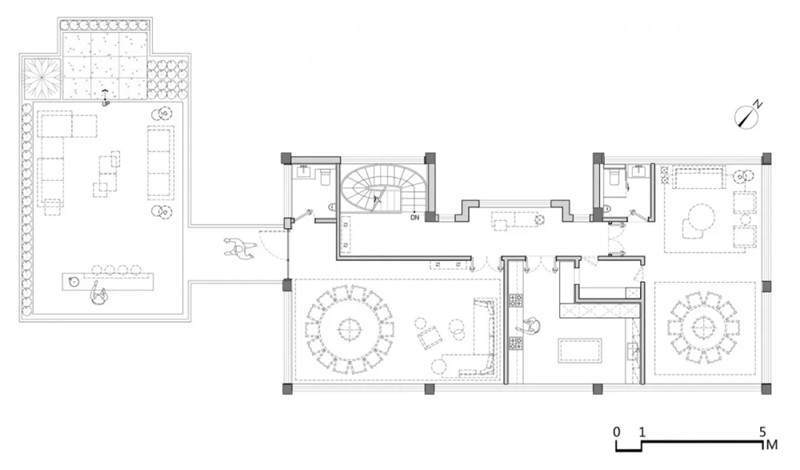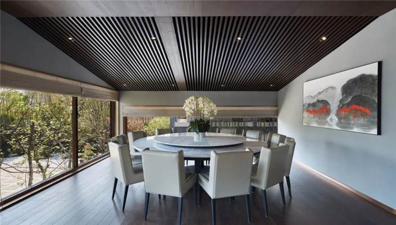 二樓設(shè)有兩間獨(dú)立包廂,供賓客攜友享用。保留古建筑原有傾斜屋頂,尊重格局而做設(shè)計(jì),大道至簡(jiǎn),方圓之間,各得其妙。借由通透的落地窗引入美好景致,讓視線變得有趣,用餐更為舒適、自然。