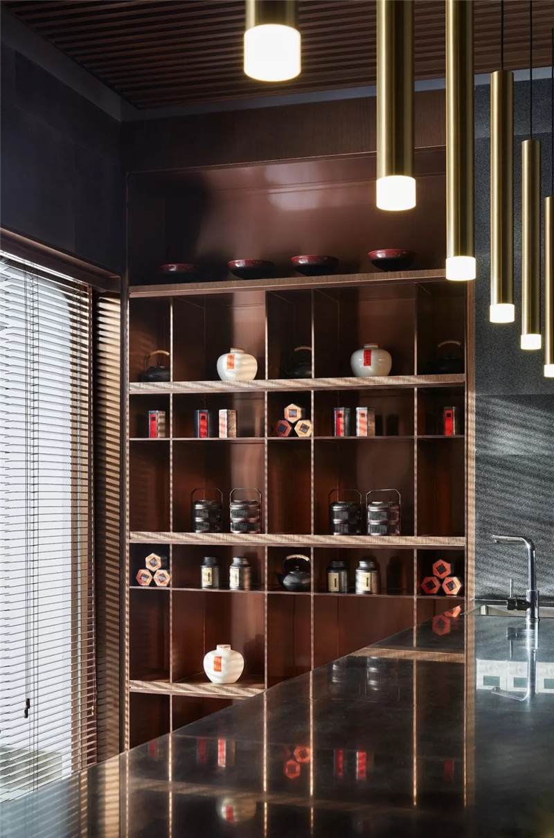 傳統(tǒng)古樸的根雕茶臺(tái)、日式絲織茶席,結(jié)合多樣材質(zhì)混搭,鋪展開(kāi)一室古雅清愜。于此飲茶一甌,以裊裊升騰的水霧構(gòu)就品茗論道的精神棲居。水吧臺(tái)與茶室相對(duì),茶文化展示架使用木格與金屬層板相交設(shè)置,以其跳躍性突破常規(guī)。