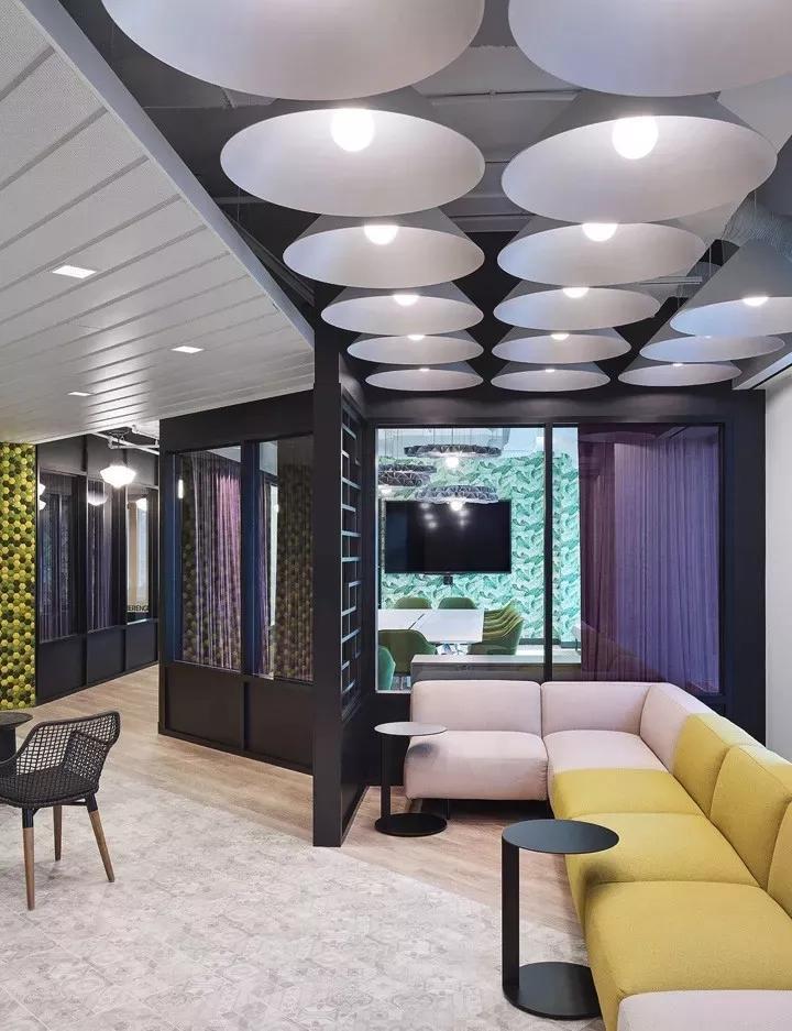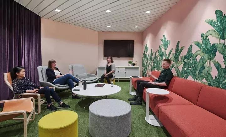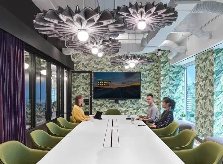 一間正式會議室,墻面鋪滿了綠色棕櫚葉墻紙,并配以綠色扶手軟椅,在綠色清新風(fēng)中,具有吸音性能的紫色布藝窗簾形成鮮明的色彩對比。毛氈聲學(xué)燈具BuzziPleat更是為整個空間錦上添花,帶來美美的視覺。