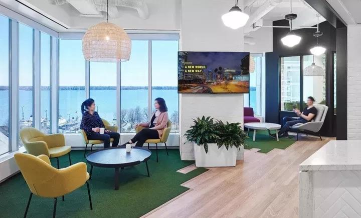 如“起居室”般的非正式會議室,則裝飾以居家般的家具營造舒適的氛圍,透過開敞的落地窗,煙波浩淼的安大略湖的美景盡收眼底,縱目四望,曠達(dá)不羈。綠色草皮般的地毯在這里隨處可見。