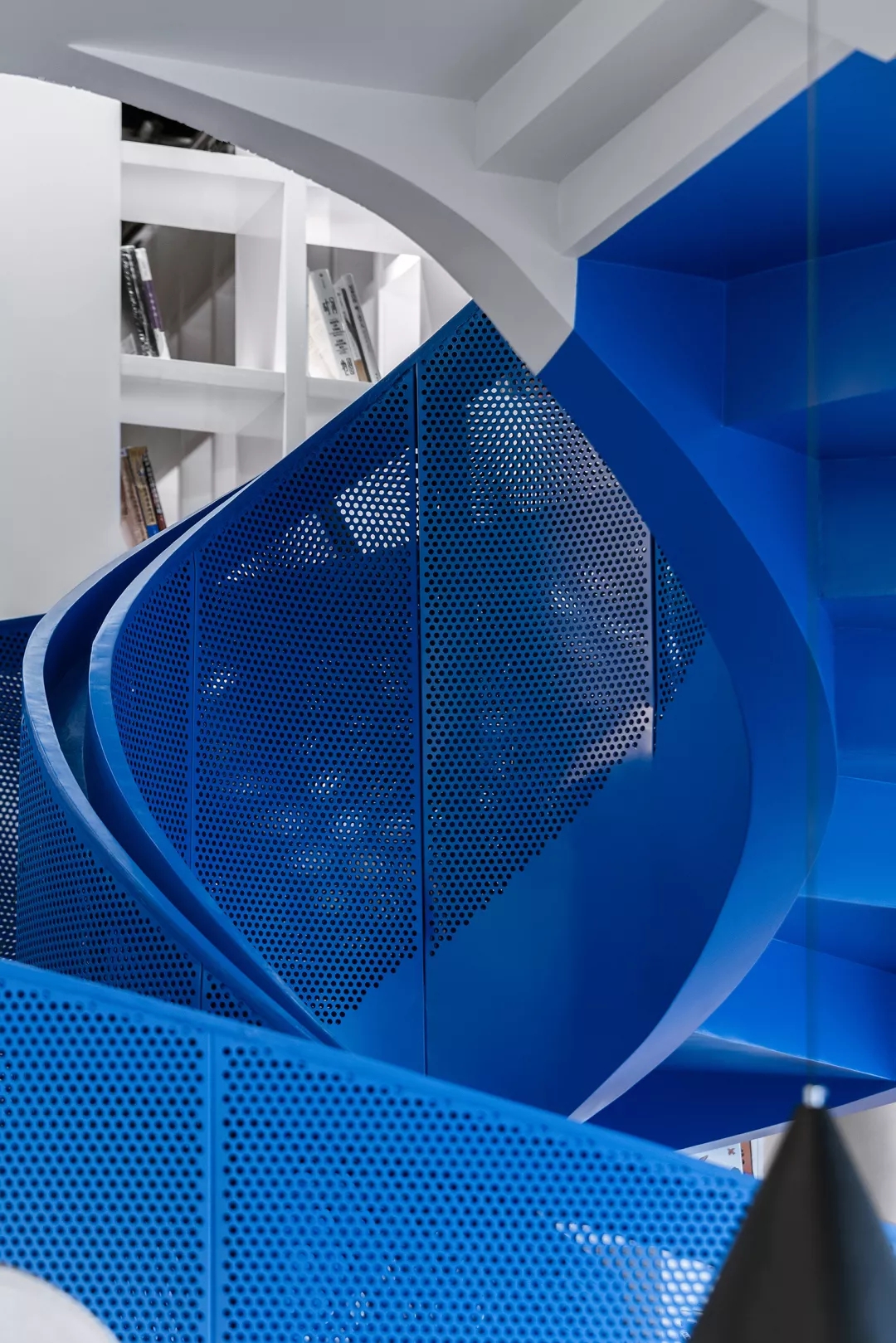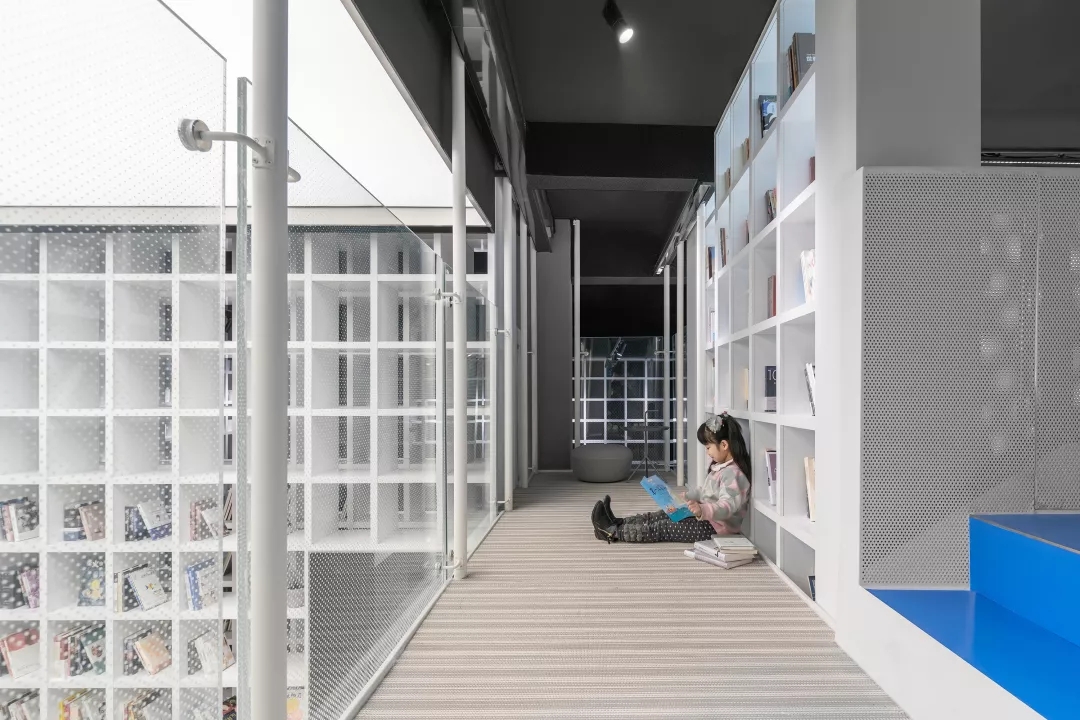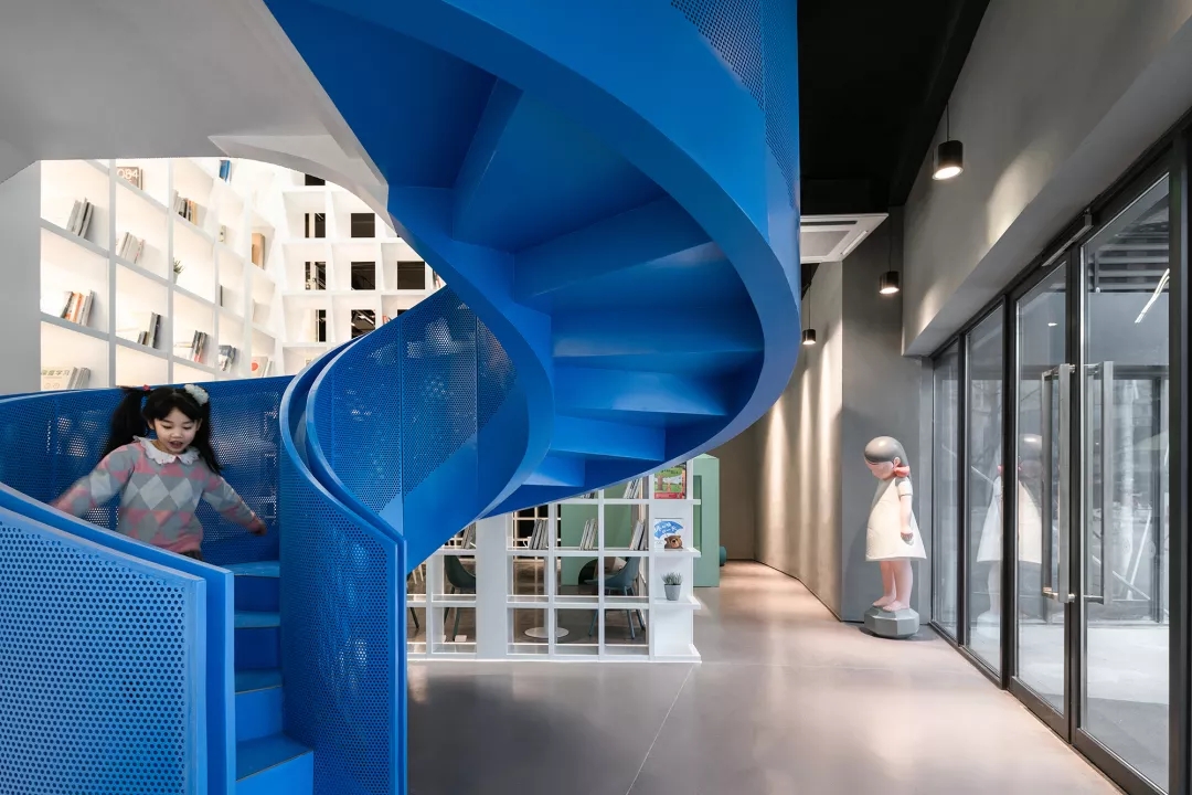 We make the reading room with Tiffany Blue as the core of the Female Box in response to the spiral staircase with Klein Blue at the entry, as well as the external kid’s area with bright yellow color at the back of the box.This community living room would be just a cliché and lose its function of demonstration if it was hidden inside of a commercial space. Youkong Living Room is more like an opening box on its façade. The four-meter high semi open entrance is made of perforated aluminum panels, which is a representational move of Wutopia Lab that from there you can see warm and gentle lightings, bright blue colors and kid‘s laughter.