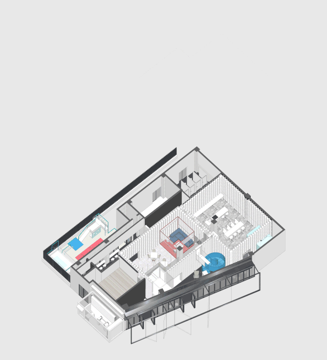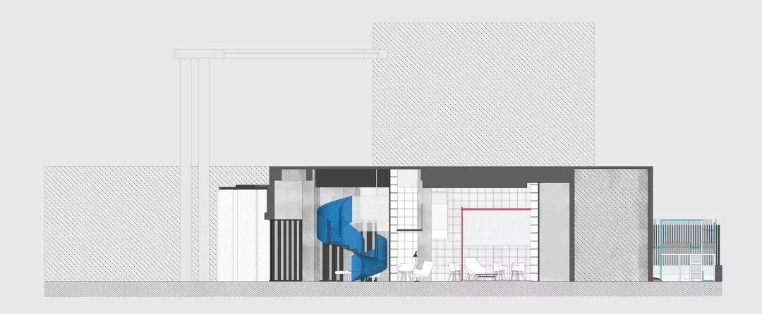 我們設(shè)計了一個夾層走廊隱藏在書架上.在課題研究中如何利用層高一直是房產(chǎn)商關(guān)心的,以我的實際經(jīng)驗,凈高2.1米仍然具有一定舒適度。在本案中,原本懸在社交盒子上的麻將房因為一樓層高過低無法成立,于是我們直接切斷,形成一個小陽臺作為暗示。