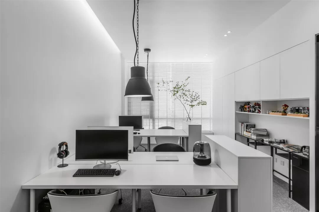 自由無拘的溝通對(duì)于團(tuán)隊(duì)的創(chuàng)新至關(guān)重要。開放的辦公區(qū)是有效獲取信息和激發(fā)靈感的地方。百葉窗折射的光影,充足的自然光營(yíng)造高效的工作環(huán)境??臻g雖然有限,但發(fā)揮最大的性能,開辟出一整面的軟裝材料搭配區(qū)。