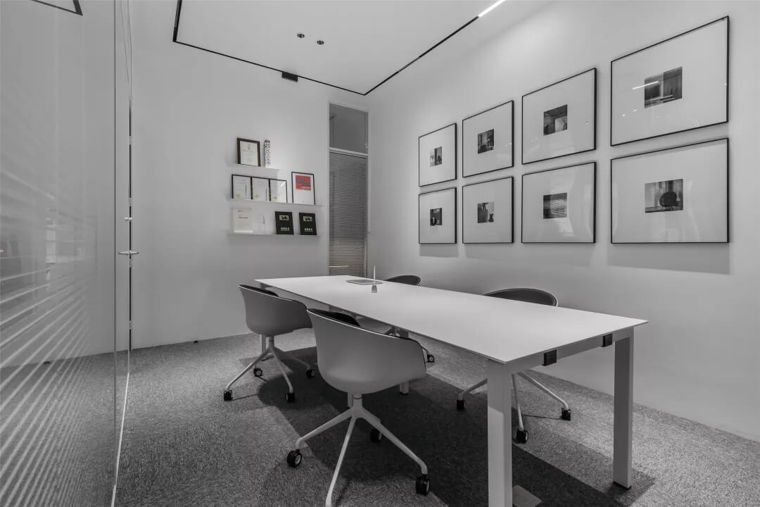 為了同時(shí)保證隱私和透明,張馳有道。會(huì)議室采用了玻璃+百葉窗的設(shè)計(jì),這樣的交流區(qū)域保持彼此的通透與聯(lián)接,提升了場(chǎng)所的張力。使用貼合設(shè)計(jì)的局部掛畫藝術(shù),配以金屬的深邃感官,多媒體影視裝置加強(qiáng)了墻面空間的信息輻射作用。