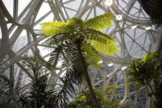 亞馬遜最新總部坐落在西雅圖商業(yè)區(qū),高達(dá)四層,是座熱帶雨林般的溫室建筑,由玻璃和白色鋼筋建造而成,老板杰夫·貝佐斯(Jeff Bezos)站在頂樓招呼員工。