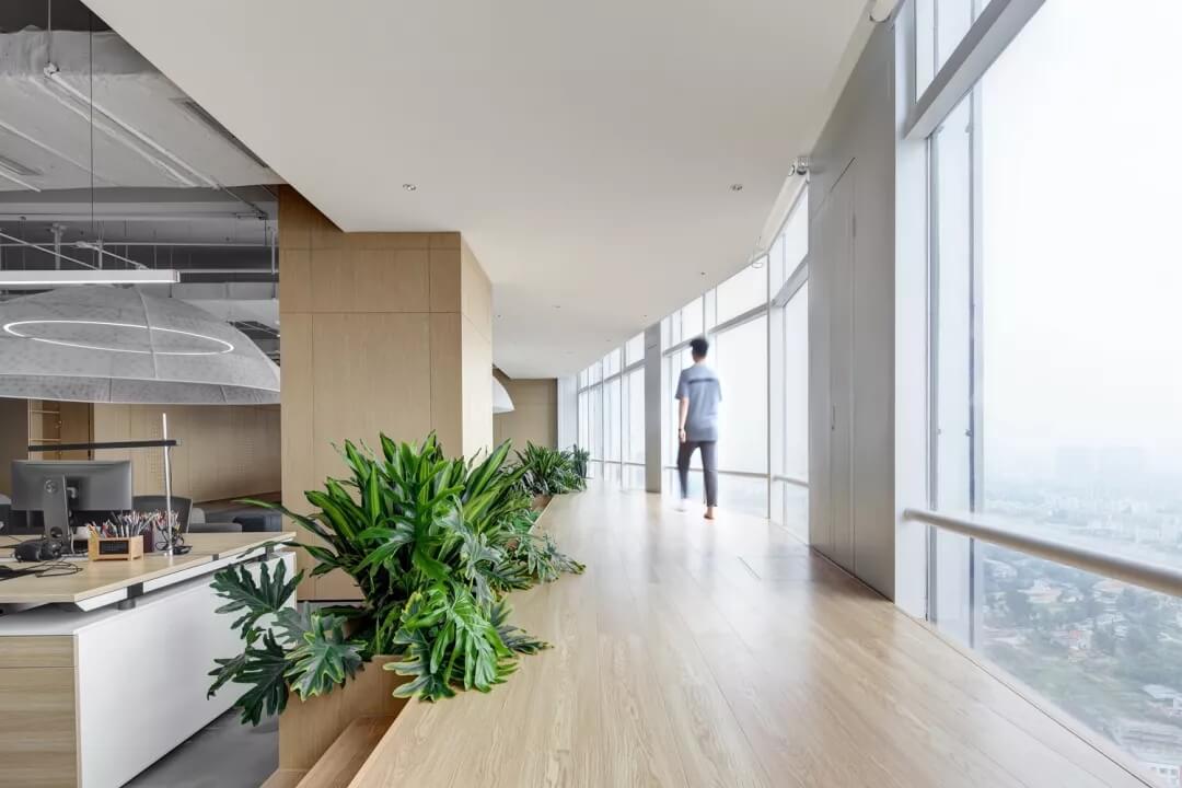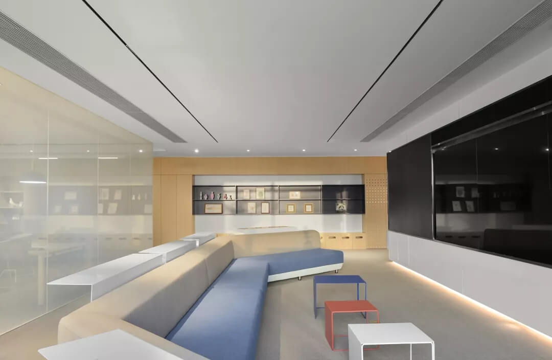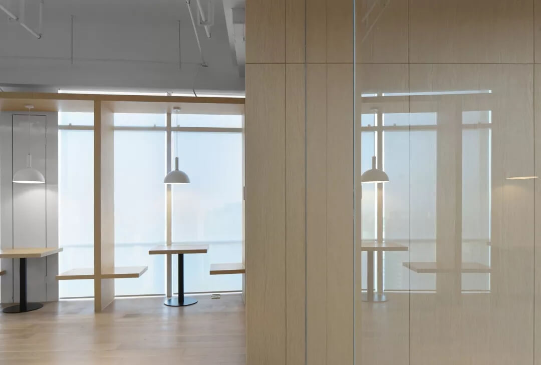 辦公區(qū)的設(shè)計打破了傳統(tǒng)辦公室嚴謹有序的陣列式布局方式,而在全景落地窗前設(shè)計出日式風(fēng)格的“榻榻米”造型,滿足了使用者對于空間多元化的體驗要求,同時分隔空間,局部抬高的空間變得生動且有張力,大大提升了空間的立體感。