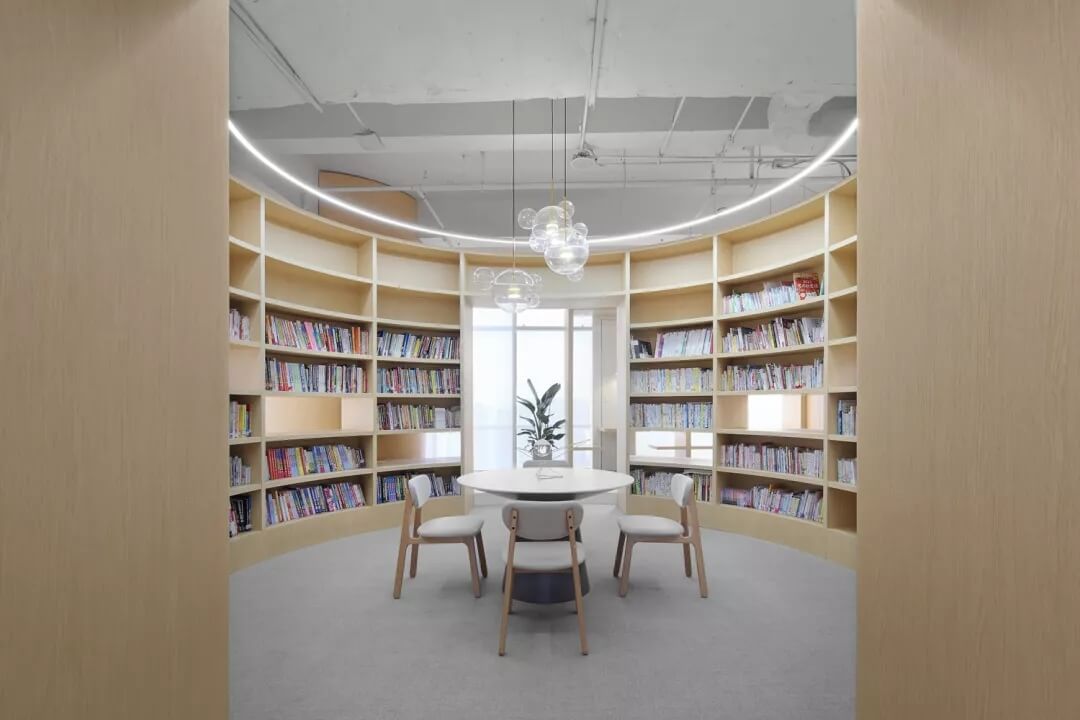空間的劃分當(dāng)中,“圓形”起到了至關(guān)重要的作用,包括培訓(xùn)室和圖書閱覽室的設(shè)計,運用圓形圓潤的特質(zhì),柔和的將空間劃分,從而使空間的運用上富有彈性,動線的流通更加靈活。位于西北角的圖書閱覽室,是整個室內(nèi)空間體量最大的一部分,同時也是此次設(shè)計亮點之一,它可放大約3000本書籍。