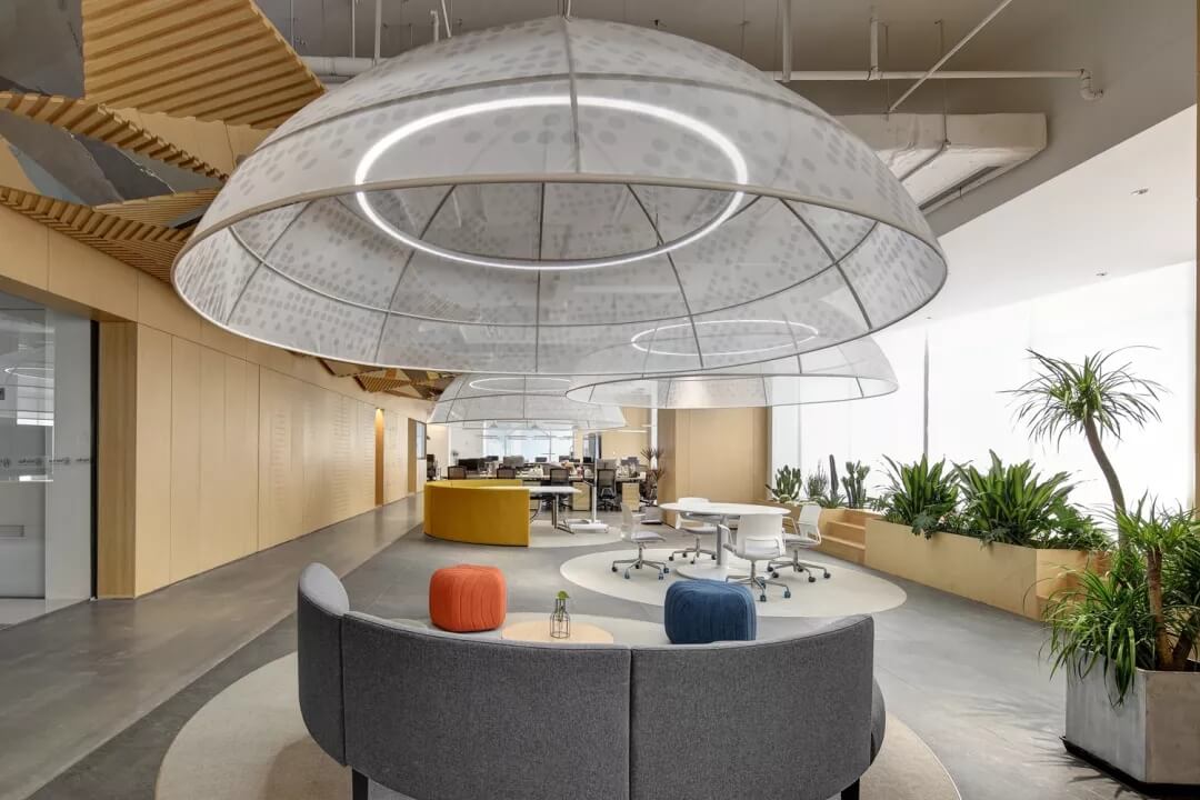 活動辦公區(qū)的圓頂造型再次運用了“圓形”元素,使得空間首尾呼應(yīng)。圓形的劃分使大面積的接待區(qū)在使用上更加靈活,網(wǎng)紗狀燈罩的設(shè)計增加了空間視覺上的朦朧感,使空間的使用更具舒適性。