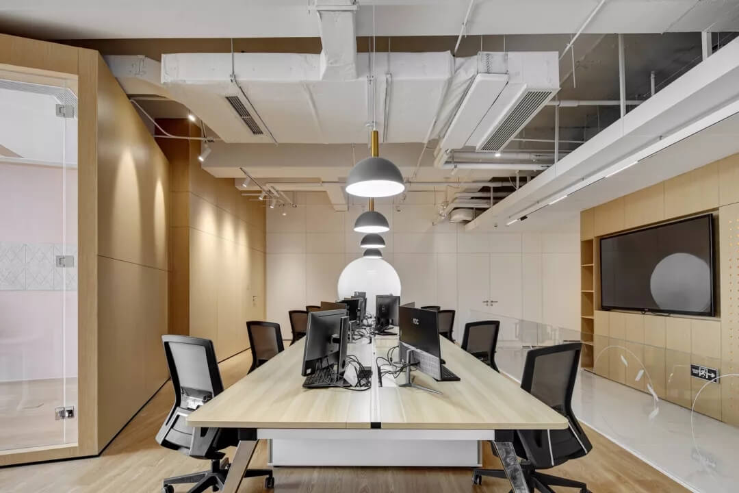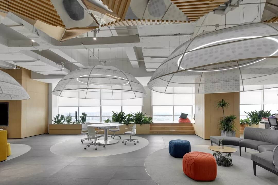 穿越員工休息區(qū),就到達了辦公室的員工工作區(qū),這里采用局部吊頂?shù)脑O(shè)計,由三角形元素組合而成的“鉆石吊頂”劃分了空間頂部構(gòu)成,挑戰(zhàn)了使用者的視覺體驗,不僅豐富了辦公區(qū)域的層次,同時也增加了空間的趣味性。