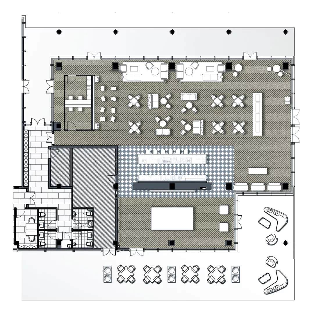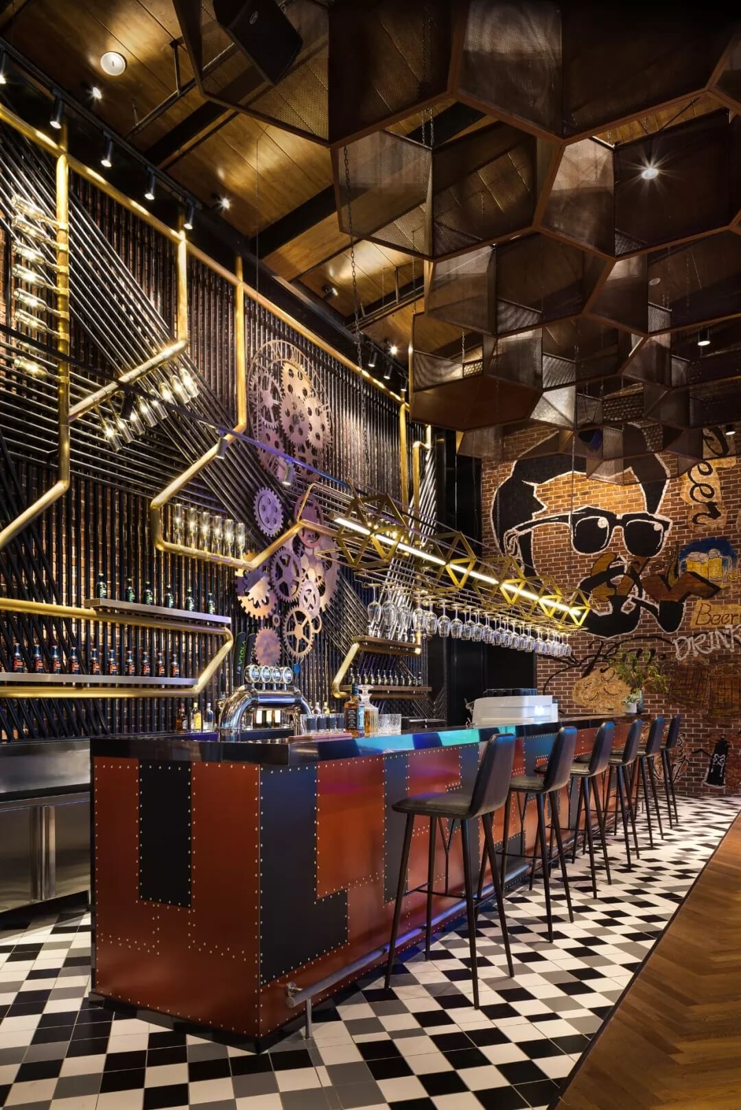 設計將足球的六邊形化用于天花的裝飾上,立體幾何的體量、金屬線條的質感賦予了社交空間的適當距離感。多幅大屏幕的配置,讓聚于此的人們,沉浸于啤酒吧和比賽現場的氛圍當中,盡情享受在開闊大氣的空間格局中觀摩賽事的自由,為熱愛喝彩,為夢想干杯,傳遞運動不止的精神。