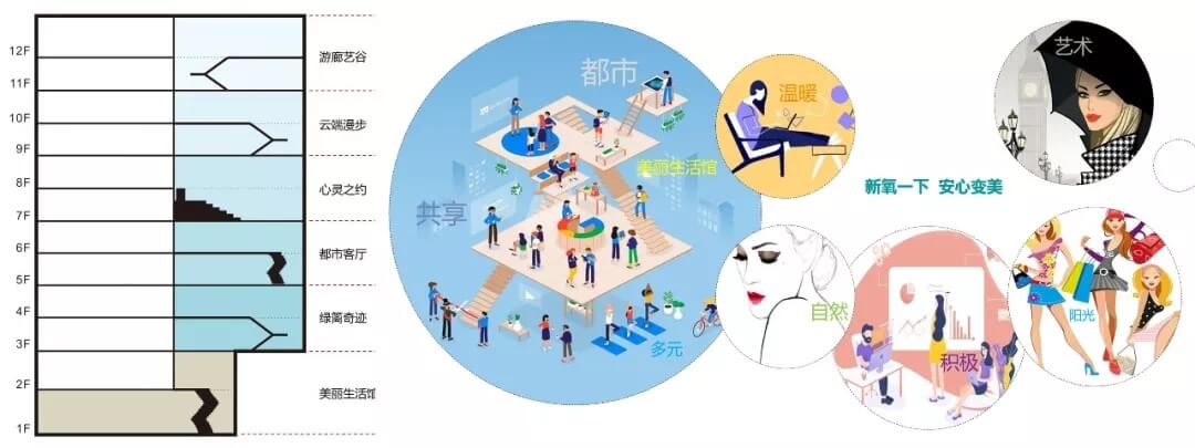 在此理念和品牌屬性的影響下,艾迪爾設計師布局辦公和診療空間,傳達出“舒適溫暖,積極自信,時尚藝術,活力陽光”的氛圍。因此在大廳布局“美麗生活館”,建筑南側每兩層設計成不同主題的公共空間。