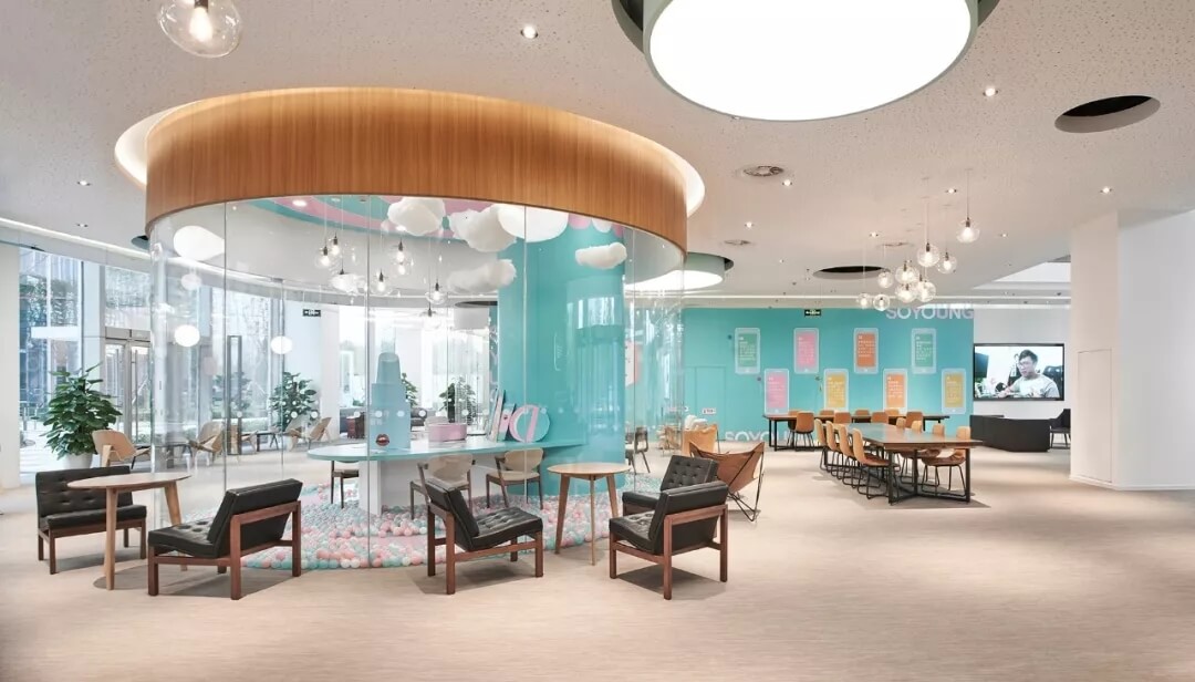美麗生活館,開拓了新的辦公空間接待區(qū)域使用模式,它融合新氧接待,面試,對外文化展示,咖啡社交等多元化功能,不僅僅是新氧人的前廳,更是對外開放,接納周邊其他企業(yè)及社會人員在此休憩,商務洽談的公共空間,充分彰顯了新氧開放包容,活力自信的社交屬性。