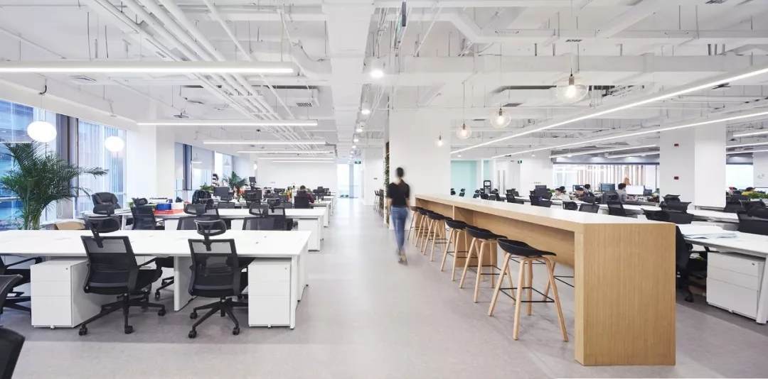 設計師在開放式的辦公區(qū)域設置長條吧臺桌,供員工自由討論辦公,午間用餐等,同時開放辦公區(qū)與南側公共島空間相連,員工可攜帶筆記本在這里沐浴著陽光辦公,討論,商務洽談,休憩等。
