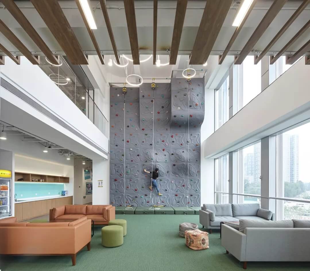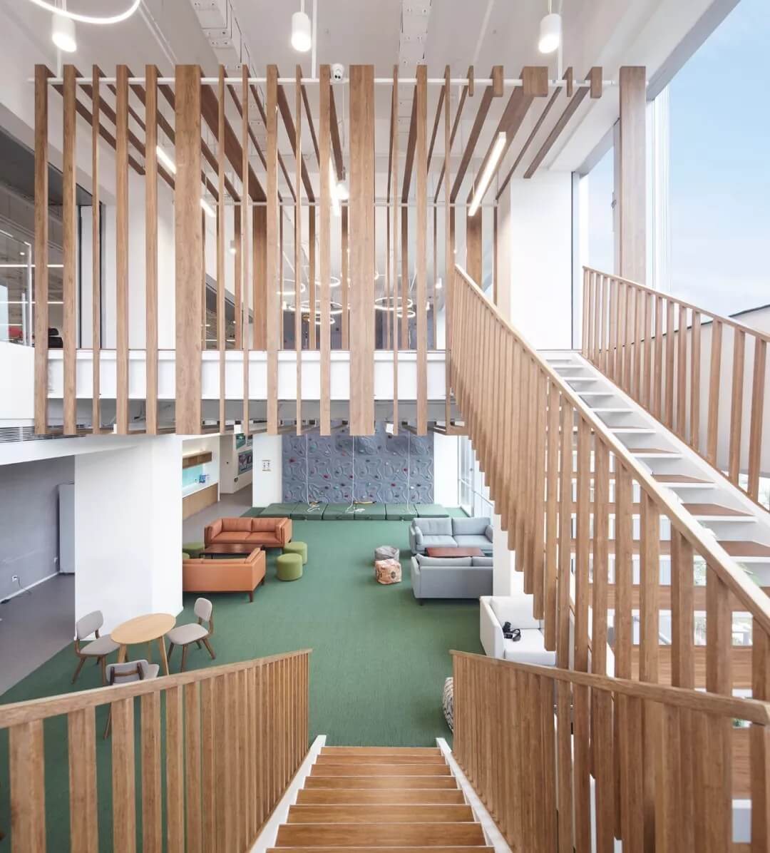 綠籬奇跡島,是自然,健康運動,挑戰(zhàn)自我的主題公共空間。木質格柵樓梯在二層延伸出一個通透的格柵BOX,形成豐富的空間層次和視覺高差。同時設置攀巖墻,瑜伽室和健身房,展現(xiàn)新氧人不懼挑戰(zhàn),運動健康的生活方式。