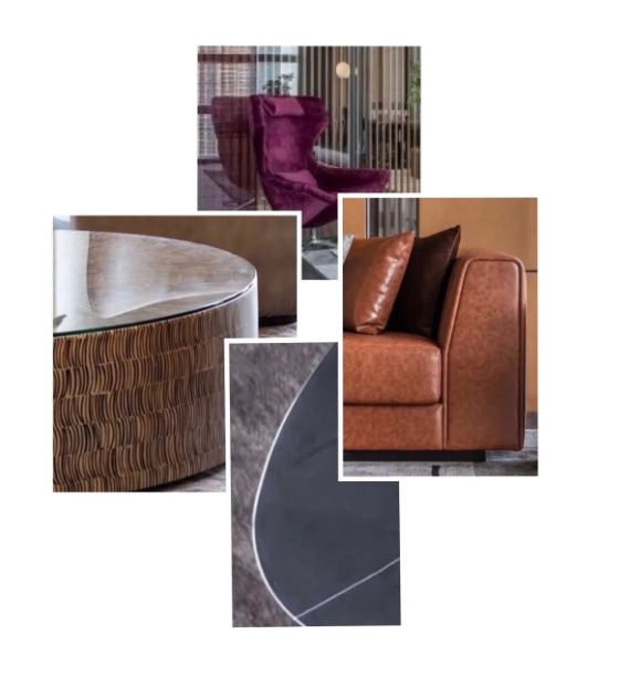 單椅大量使用皮革凸顯質(zhì)感,同時(shí)在家具上通過黑鋼、木及玻璃等打造硬朗穩(wěn)重的商務(wù)格調(diào)。