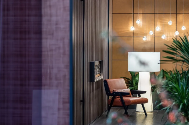 前廳一角,一把隨意的休閑椅構(gòu)設(shè)出安靜而獨(dú)立的等候區(qū)。光是一味奇妙而誘惑的催化劑,見證格柵的參差錯(cuò)落,旖旎于水滴狀通透吊燈,如同午夜巴黎那一杯令人情迷的威士忌,透過光影的變幻,實(shí)現(xiàn)精尚定調(diào)。