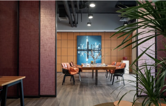 設(shè)計(jì)師認(rèn)為辦公空間的設(shè)計(jì)也應(yīng)該是溫暖的、充滿關(guān)愛的,通過空間的靈活切換為客戶創(chuàng)造更多的商業(yè)價(jià)值。墻面以磁性黑板漆穿插其間,實(shí)現(xiàn)視覺上的層次迭代。薄暮紫夾絲玻璃推拉門實(shí)現(xiàn)了會(huì)議室與辦公區(qū)的自由切換,開放式空間為來(lái)此進(jìn)行房產(chǎn)咨詢的精英人士提供了線下答疑、培訓(xùn)學(xué)習(xí)的平臺(tái),成就雙方合作共贏的發(fā)展期待。