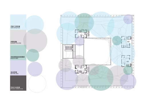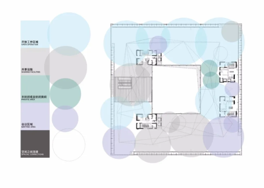 該項目的另一個重要的設(shè)計出發(fā)點是設(shè)計師期望將上海這個城市的活力與多樣性引入并轉(zhuǎn)化為工作空間的功能分布,因此,整個辦公室中從任意工位出發(fā)走到就近洽談