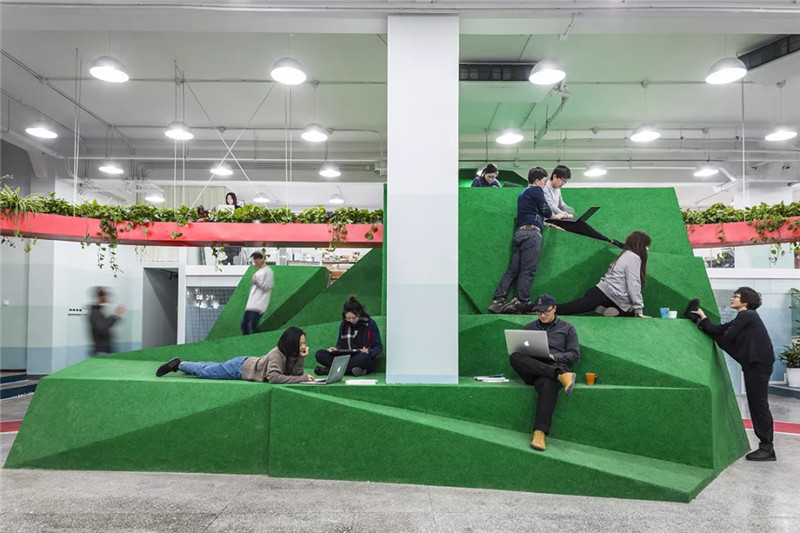 與“紅環(huán)”相交的“小山”是另一處混合休閑與工作的場所,坐落在辦公空間的另一端,傾斜的表面適應各種姿勢,中間的小路通往夾層。辦公室內(nèi)還配有專門的活動空間,包括一個單獨的健身房,冥想空間和會議室。
