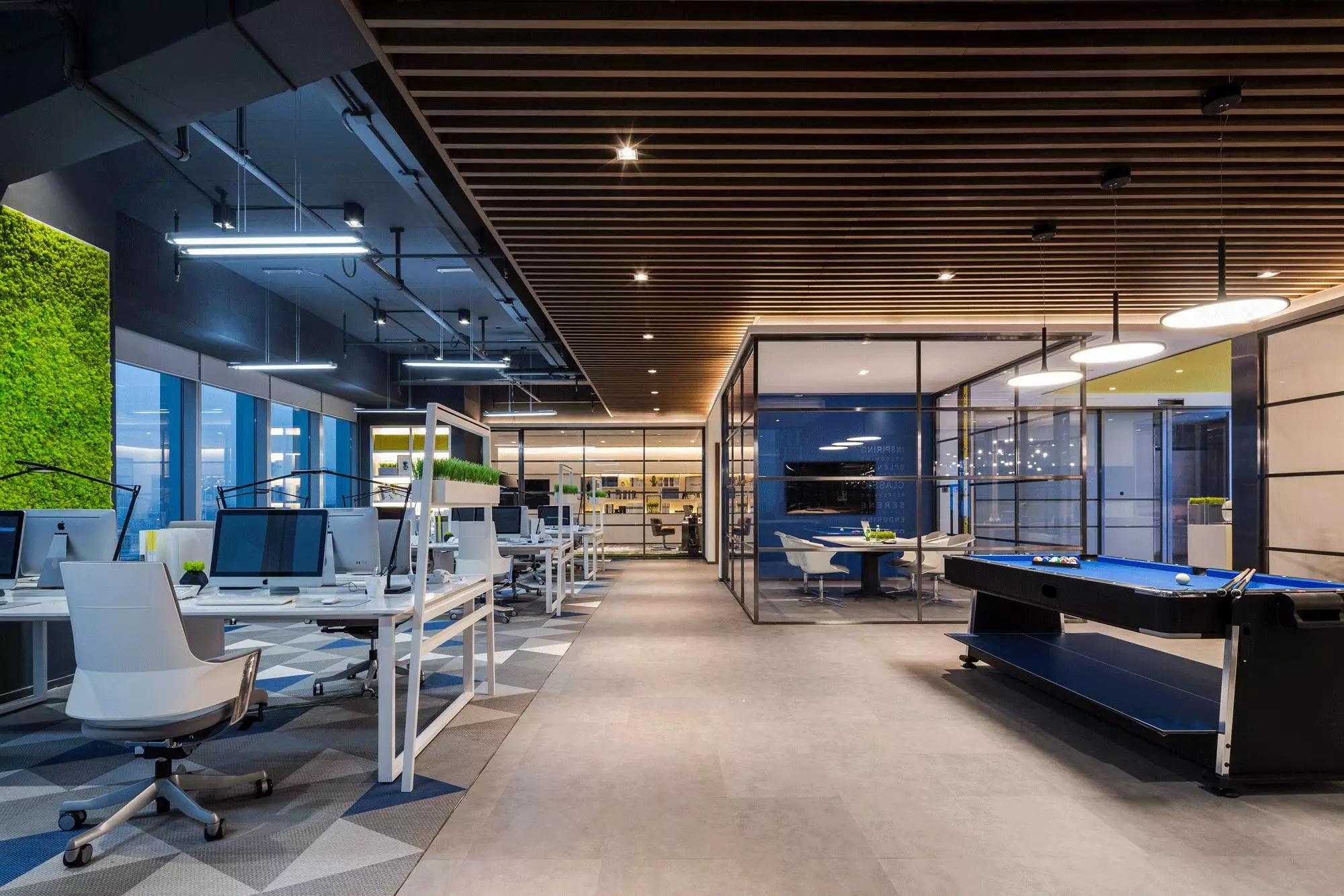 裸露的天花與木格柵的設(shè)計(jì),形成反差,重點(diǎn)突出了原建筑的空間感,與時(shí)下設(shè)計(jì)熱點(diǎn)相適應(yīng);臺球的細(xì)節(jié)設(shè)計(jì),體現(xiàn)了公司對員工精神層面上的關(guān)懷,工作之余,還可打一桿臺球放松身心。